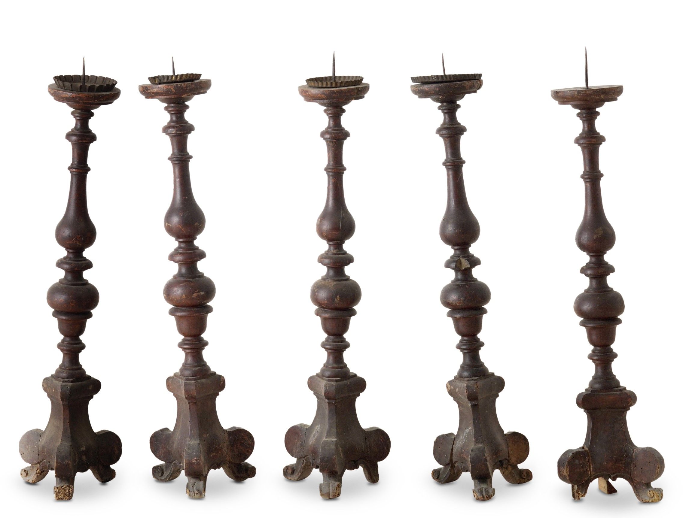 Lotto composto da cinque torciere in legno intagliato. XVIII secolo