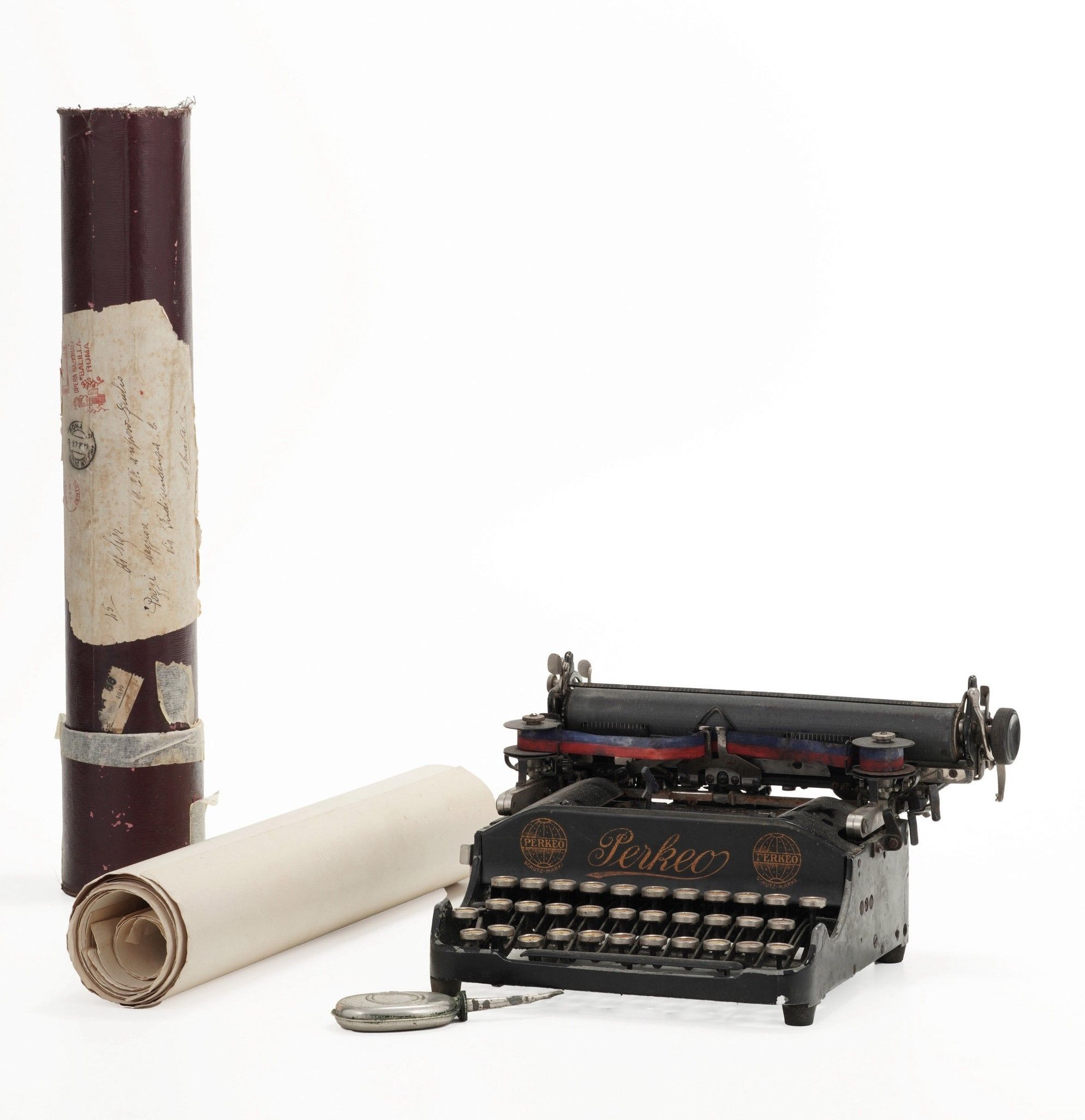 Lotto composto da una macchina da scrivere in custodia e un rotolo di documenti