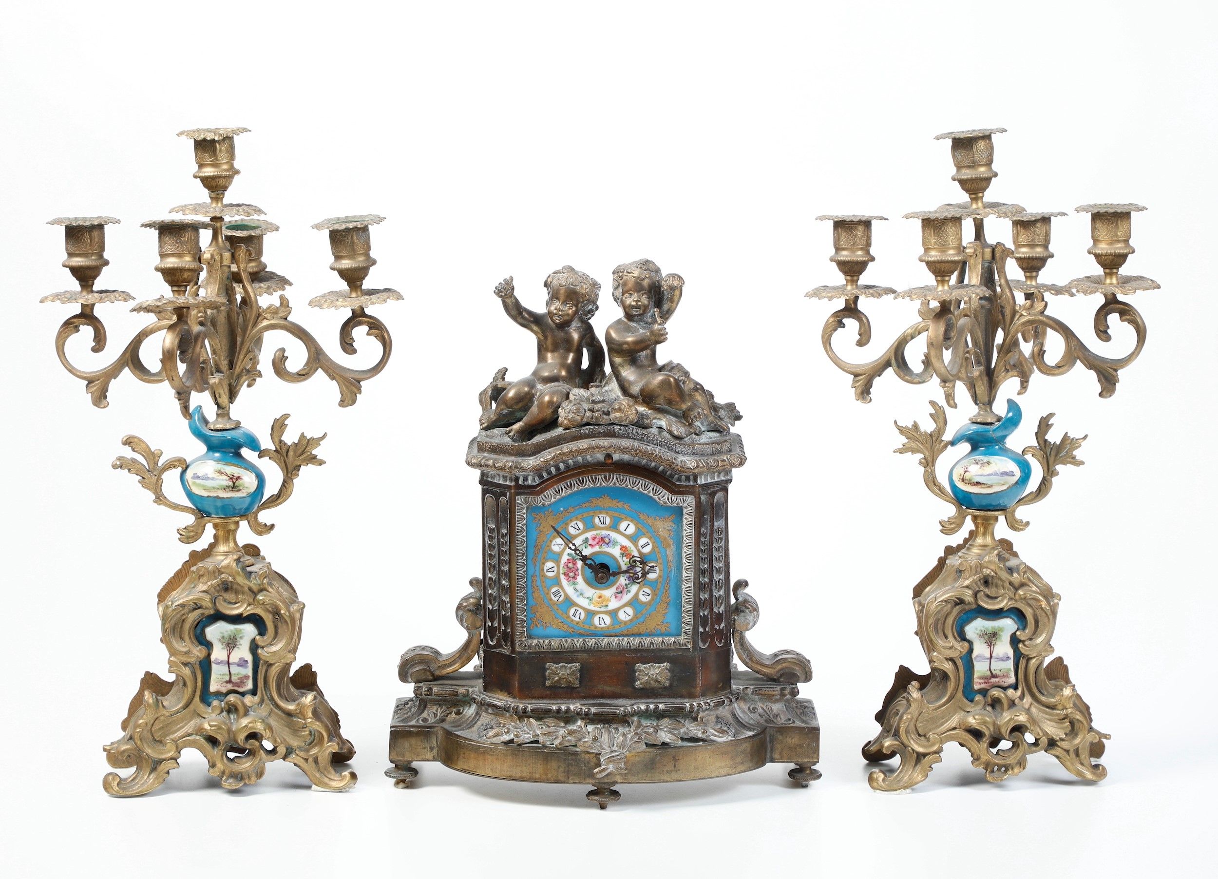 Trittico composto da pendola da tavolo e coppia di candelabri. Francia XX secolo