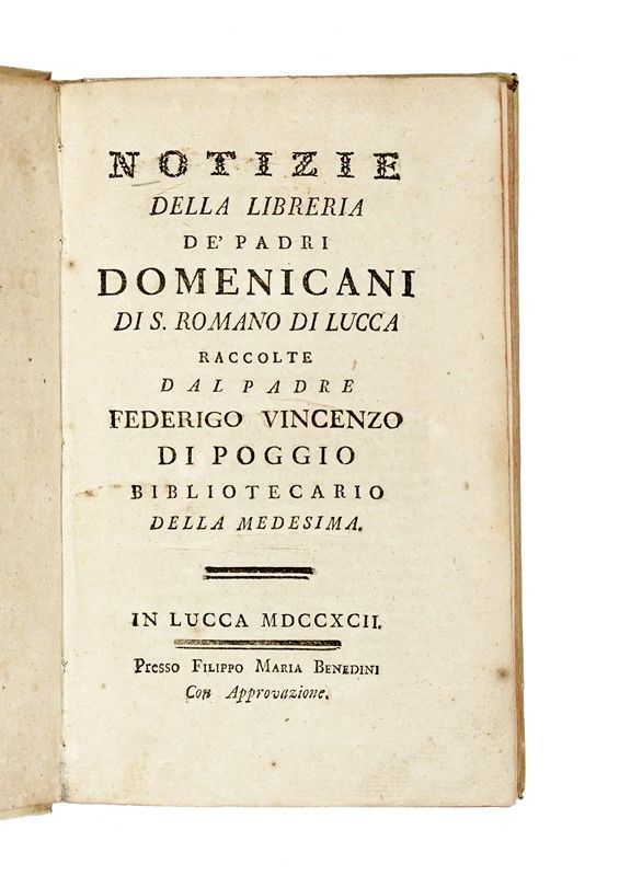 In-4° (mm 228x163). Pagine [24], 264. Iniziali e fregi xilografici. Piena pergamena coeva con titolo manoscritto al dorso. SI AGGIUNGE: Di Poggio Federico Vincenzo, Notizie della libreria de' padri domenicani di S. Romano di Lucca... In Lucca: presso Filippo Maria Benedini, 1792. In-8° (mm 200x124). Pagine 216, uniformemente ingiallite. Pergamena rigida coeva, tagli spruzzati.