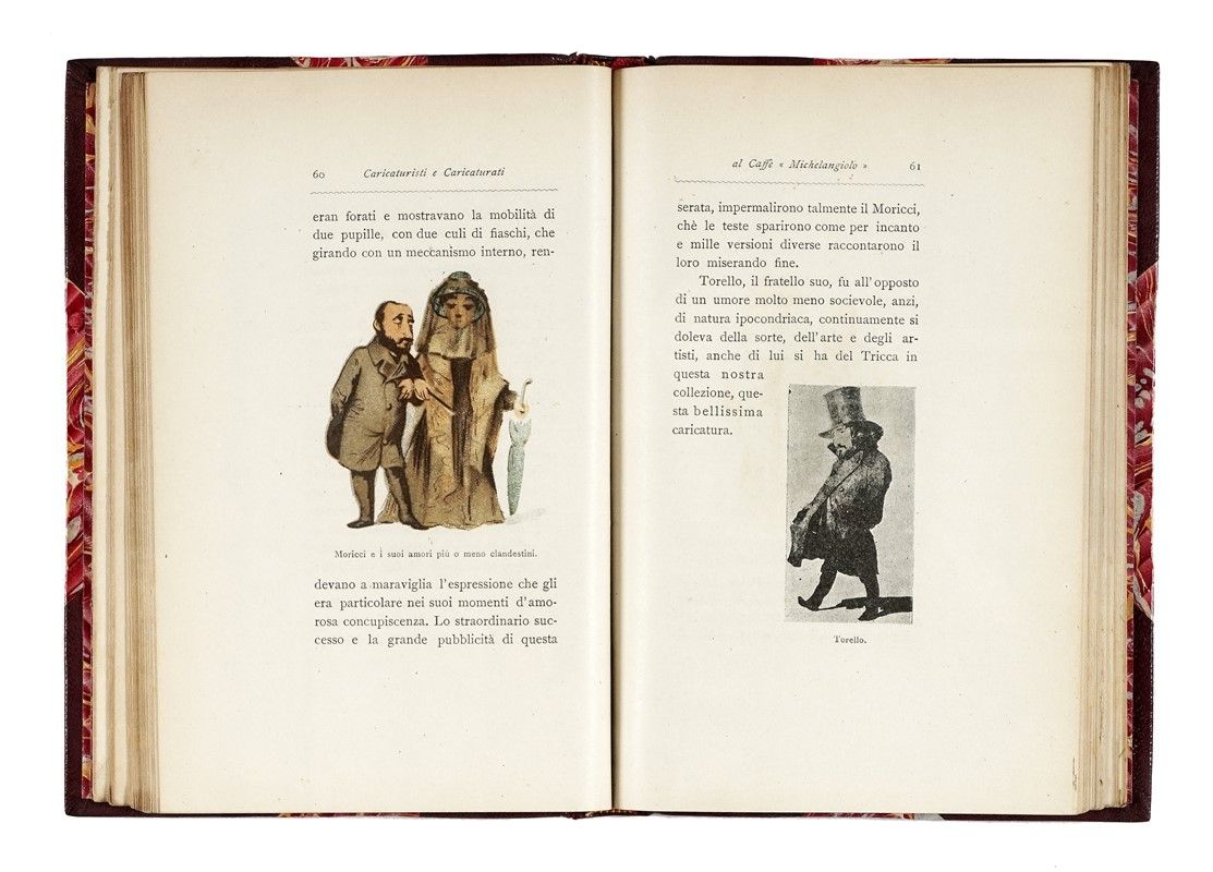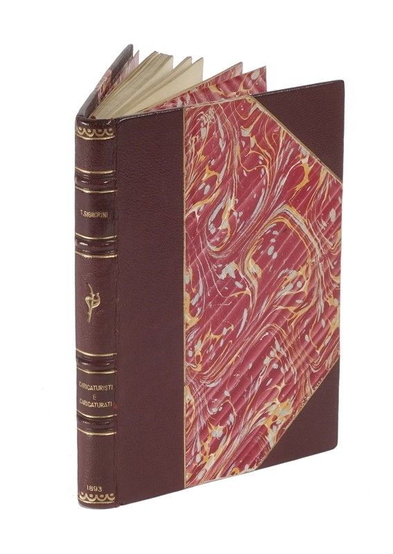 In- 8° (mm 180x118). Pagine 146, [2] con 54 incisioni in bianco e nero e 8 cromolitografie interne alle pagine. Carte pallidamente ingiallite in modo uniforme. Legatura moderna in mezza pelle con titoli dorati al dorso, conservate tutte le brossure originali illustrate a colori.