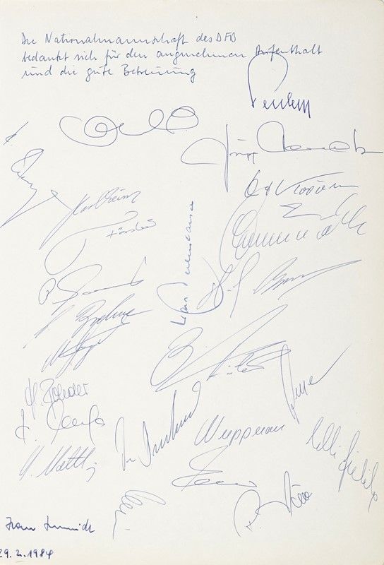 Carta con firme autografe dei giocatori della DFB (Deutscher Fußball-Bund).