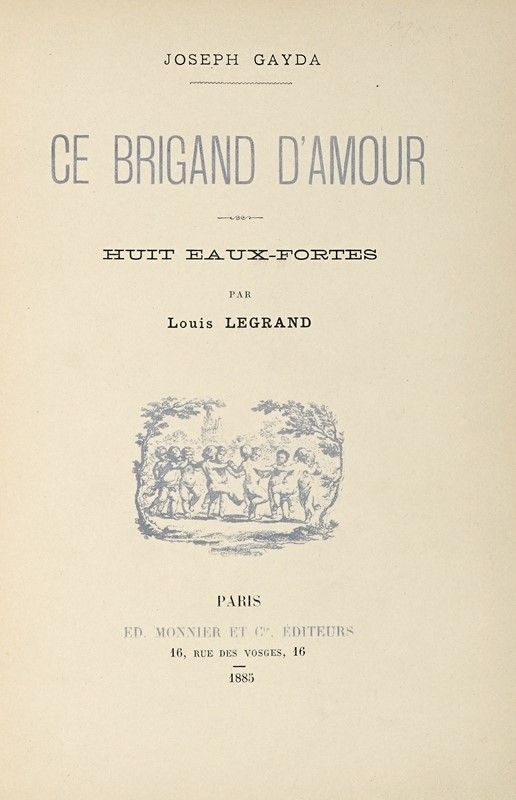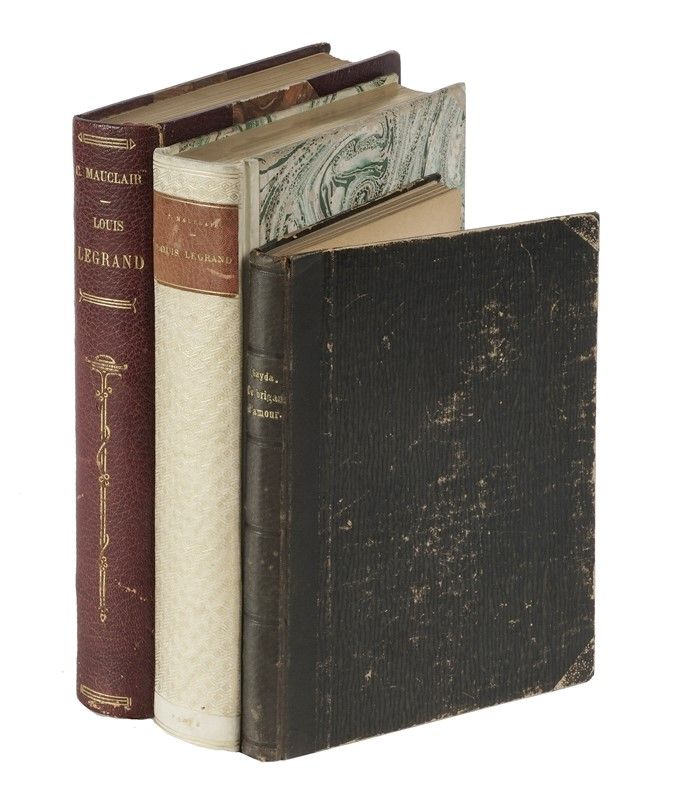 In-8° (mm 215x150). Frontespizio stampato in blu e nero con vignetta rappresentante puttini danzanti. Volume con otto incisioni di Legrand complete delle loro veline protettive azzurre. Carte pallidamente ingiallite. Mezza tela nera coeva (un po' stanca e con abrasioni alle estremità). SI AGGIUNGE: Mauclair Camille, Louis Legrand: Peintre et graveur par Camille Mauclair. Paris: H. Floury: G. Pellet, [1910]. In mezzo marocchino rosso coevo (cerniera anteriore spaccata). SI AGGIUNGE: Idem, Louis Legrand: Peintre et graveur par Camille Mauclair. Paris: H. Floury: G. Pellet, [1910]. In elegante mezza pergamena coeva.