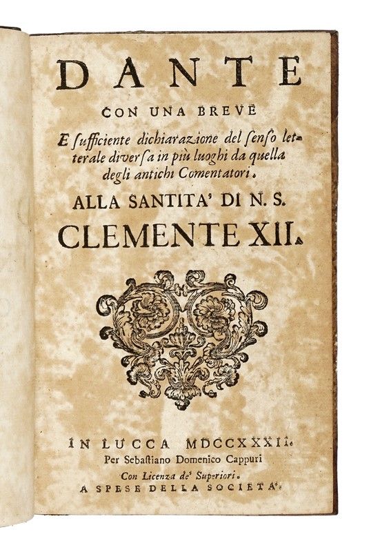 3 volumi in-8° (mm 180x120). Assenti le carte bianche, per il resto collazionato completo. Carte arrossate, margine superiore corto, minimi restauri all p. 2 e 214 del Purgatorio. Mezza pelle coeva con titoli e decorazioni dorate al dorso (minime tracce del tempo).