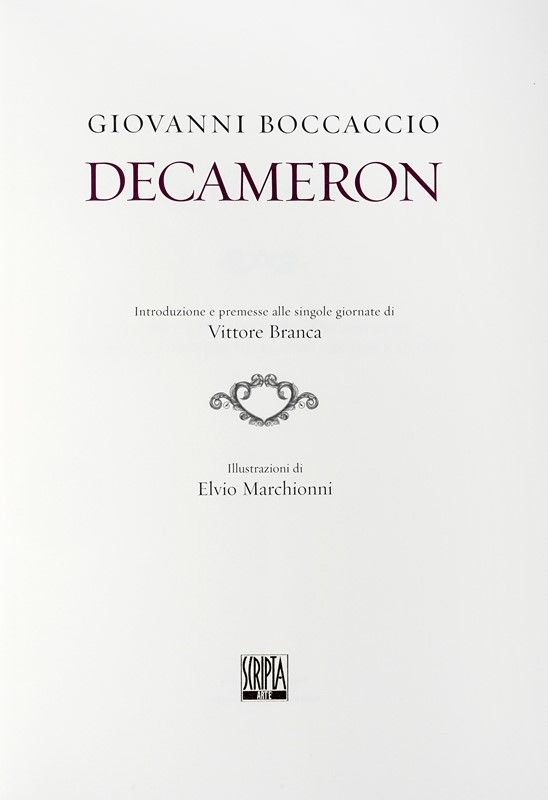 In-folio (mm 450x315). Ottimo esemplare, profusamente illustrato a colori da Elvio Marchionni. Legatura originale in piena pelle, con titoli in oro al dorso e placca in argento sbalzato al piatto anteriore, realizzata dall'Artista. Entro cofanetto editoriale in piena tela grigia con titoli al piatto e al dorso. Uno dei 75 esemplari in numeri romani, su una tiratura complessiva di 1050 copie.