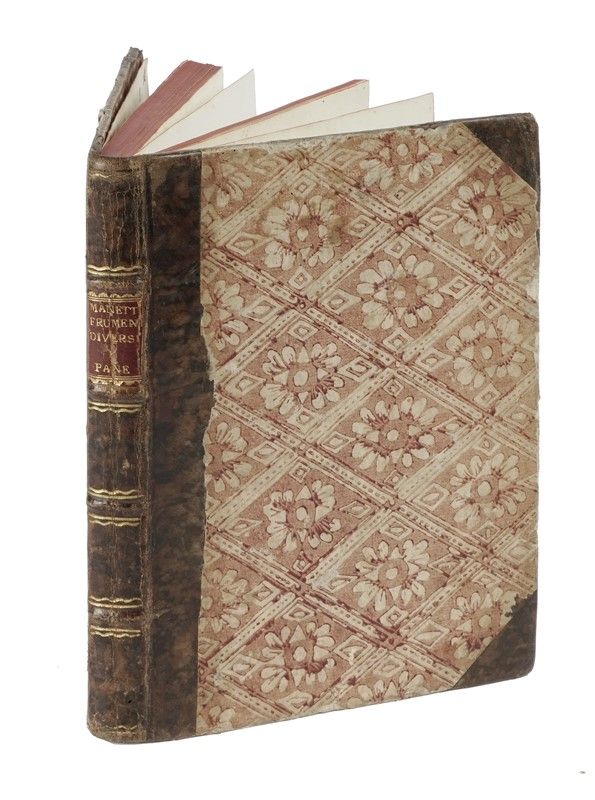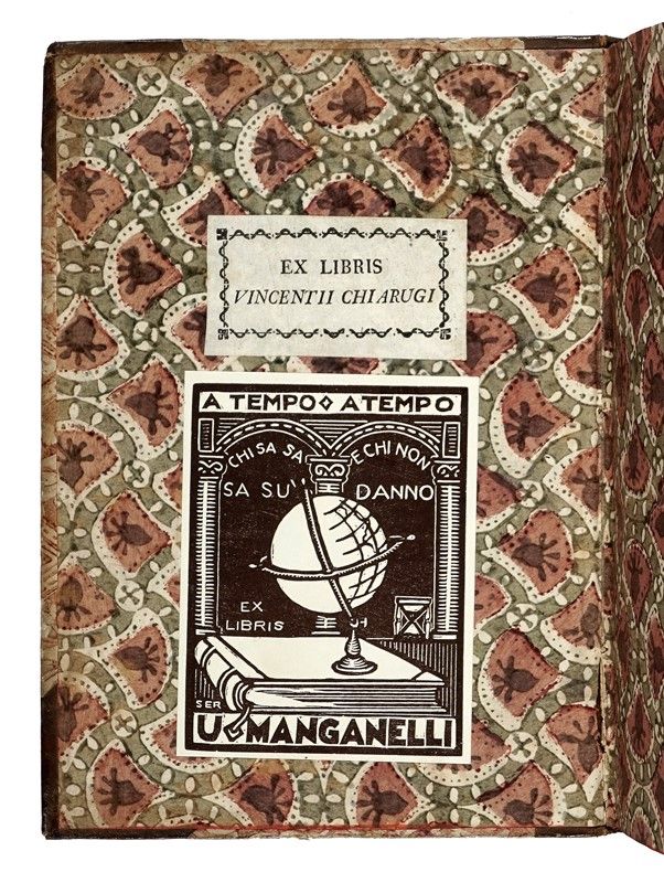 In-4° (mm 200x142). Acefalo e con carte occasionalmente fiorite. Mezza pelle coeva, dorso a nervi con tassello rosso e filetti dorati, piatti rivestiti in carta decorata, tagli rossi. Ex libris "Vincentii Chiarugi" e "U. Manganelli".