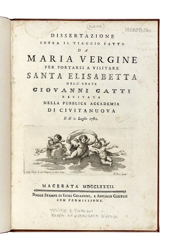 In 4° (mm 262x184). Pagine: XVIII, [II]. Frontespizio con vignetta calcografica e altre belle testatine e finalini calcografici con putti. Sottile macchietta marginale alle ultime due carte e altre minime tracce del tempo. Con una tavola ripiegata in fine, colorata a mano, del viaggio di Maria Vergine per visitare S. Elisabetta.