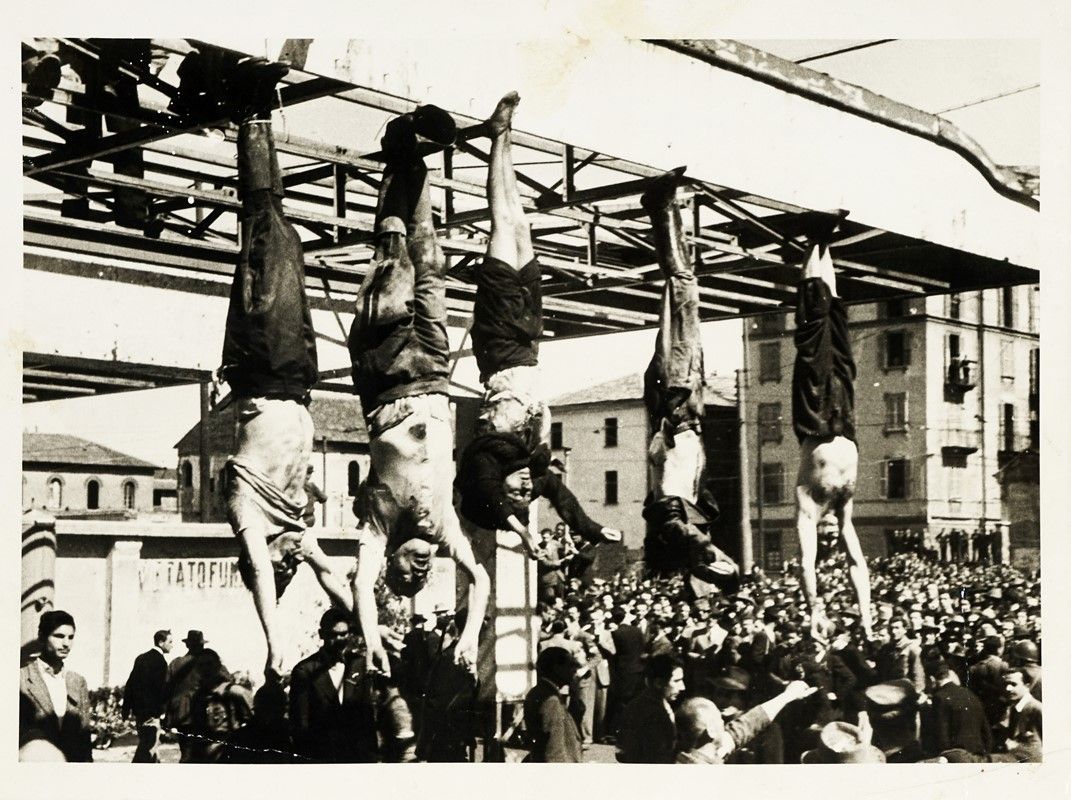 Fotografia di Renzo Pistone (come indicato dal timbro al verso: Foto d’arte / Renzo Pistone / 29 aprile 1945 / Milano – Via Lazzaro Papi 3 / Telef. 55-705 / Fotografo autorizzato). Fotografia che ha fatto la storia e che cristallizza un momento del passato italiano. Ritrae, in Piazzale Loreto a Milano, il corpo senza vita di Benito Mussolini, della compagna Claretta Petacci, insieme a quelli di Nicola Bombacci, Alessandro Pavolini e Achille Starace. Dimensioni: 178x240 mm.