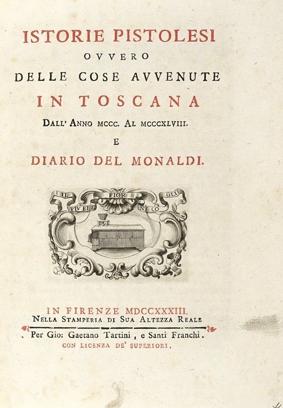 Compongono il lotto: 1) Caggese Romolo, Statuti della Repubblica fiorentina… Firenze: Tipografia Galileiana, 1910. Due volumi; 2) La parrocchia di S. Martino a Mensola. Firenze: tipografia e cartoleria militare di Tito Giuliani, 1866; 3) Conti Cosimo, La prima reggia di Cosimo I De Medici... Firenze: Giuseppe Pellas, 1893; 4) V. Alinari e A. Beltramelli, L'Arno con prefazione di Isidoro Del Lungo. Firenze: Fratelli Alinari, 1909; 5) Dal Pozzo Toscanelli Paolo, Ricordo del solstizio d'estate del 1892. Firenze: stabilimento topografico fiorentino, 1892; 6) Amidei Gaspero, Delle istorie Volterrane... Volterra: tipografia Sborgi, 1865; 7) Giannotti Donato, Della Repubblica Fiorentina... In Venezia: Per Gio. Gabbriel Hertz, 1722; 8) Cappelletti Licurgo, Lapidi Dantesche che si trovano collocate in alcune vie e piazze di Firenze. Firenze: Successori B. Seeber, 1916; 9) Guazzesi Lorenzo, Osservazioni storiche del cavaliere Lorenzo Guazzesi… In Arezzo: nella stamperia di Michele Bellotti, 1752; 10) Documenti e sommario di tutte le cappelle tassate dall'illustrissimo e reverendissimo monsignore Alessandro Marzimedici arcivescovo fiorentino... In Firenze: nella stamperia arcivescovale di Pietro Matini, 1720; 11) Pesci Ugo, Firenze capitale. Firenze: R. Bemporad & Figlio, 1904; 12) Atti e decreti del Concilio diocesano di Pistoia dell'anno 1786. Pistoia; 13) Carocci Guido, L'illustratore Fiorentino... Firenze: tipografia Domenicana, 1903. Tre volumi; 14) Monaldi Guido, Istorie pistolesi ovvero delle cose avvenute in Toscana... In Firenze: nella stamperia di sua altezza reale: per Gio. Gaetano Tartini, e Santi Franchi, 1733; 15) Ammirato Scipione, Istorie fiorentine di Scipione Ammirato… In Firenze: per Amador Massi Forliuese,1647. In tre volumi; 16) Ademollo Agostino, Firenze al tempo dell'assedio... Firenze: stabilimento di Ferdinando Chiari, 1853. Seconda edizione in 6 volumi.