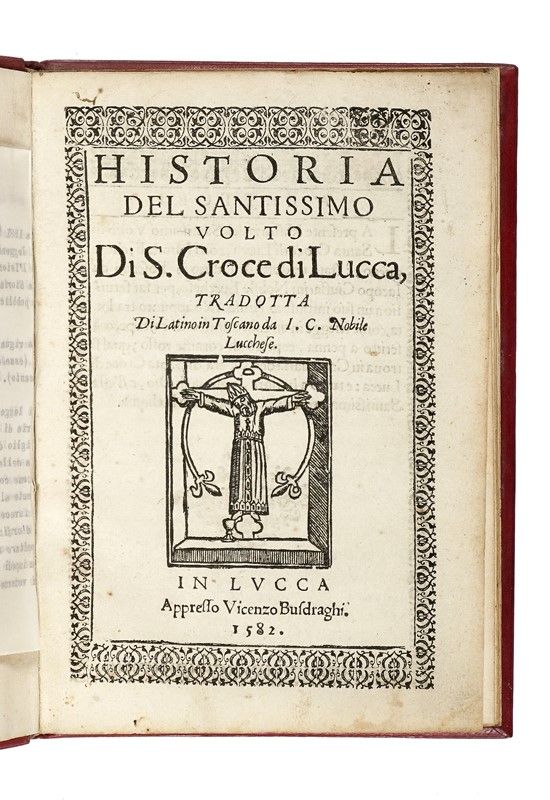 In-4° (mm 196x135). Frontespizio con vignetta xilografica del Volto Santo di Lucca, testo in corsivo entro cornice tipografica floreale. Collazionato completo con carte croccanti con pallidi aloni e lievi difetti alle pagine finali, minimo lavoro di tarlo al margine superiore delle prime carte. Marocchino rosso moderno con fregio e decorazioni dorate.