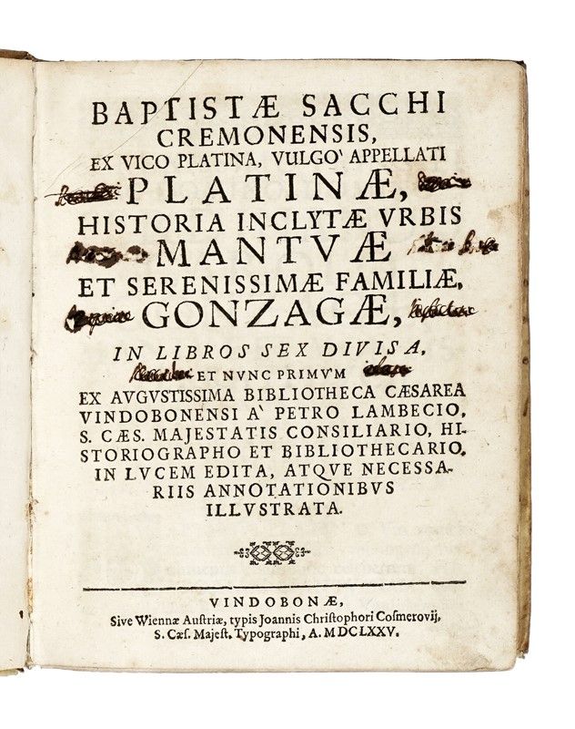 In-4° piccolo (mm 186x150). Bella antiporta calcografica con il ritratto di Bartolomeo Sacchi, detto "Platina", con fregi floreali e animali. Carte occasionalmente arrossate, piccolo lavoro di tarlo alle ultime carte, non collazionato. Due interessanti tavole calcografiche con i carrocci di Padova e Cremona. Pergamena rigida coeva con titoli manoscritti al dorso, tagli rossi.