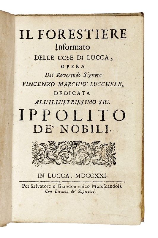 In-8° (mm 160x104). Carte pallidamente brunite. Pergamena flessibile coeva con titolo su tassello al dorso. SI AGGIUNGE: Guida del Forestiere per la Città e il Contado di Lucca. Lucca: Dalla Tipografia di Francesco Baroni, 1820.