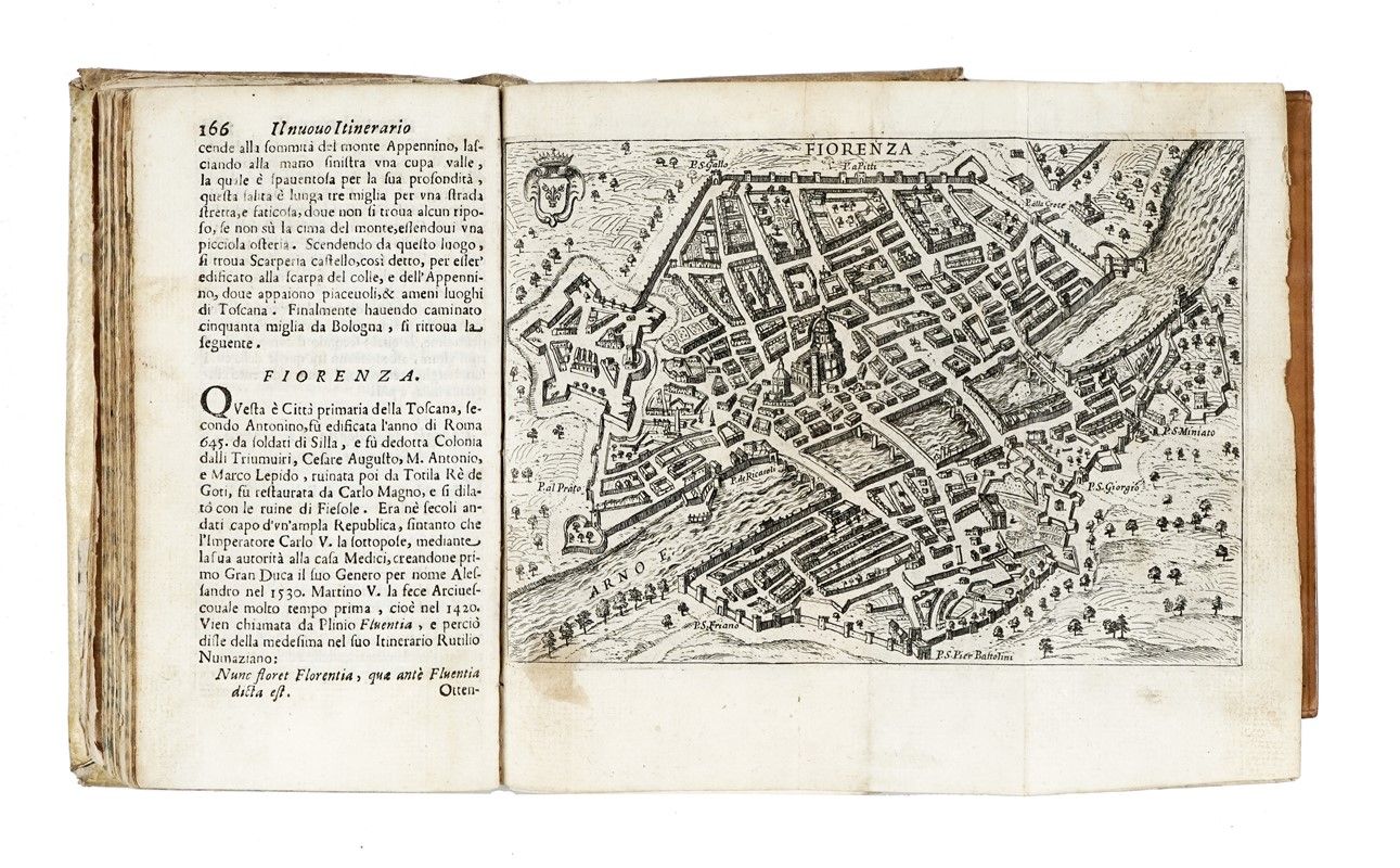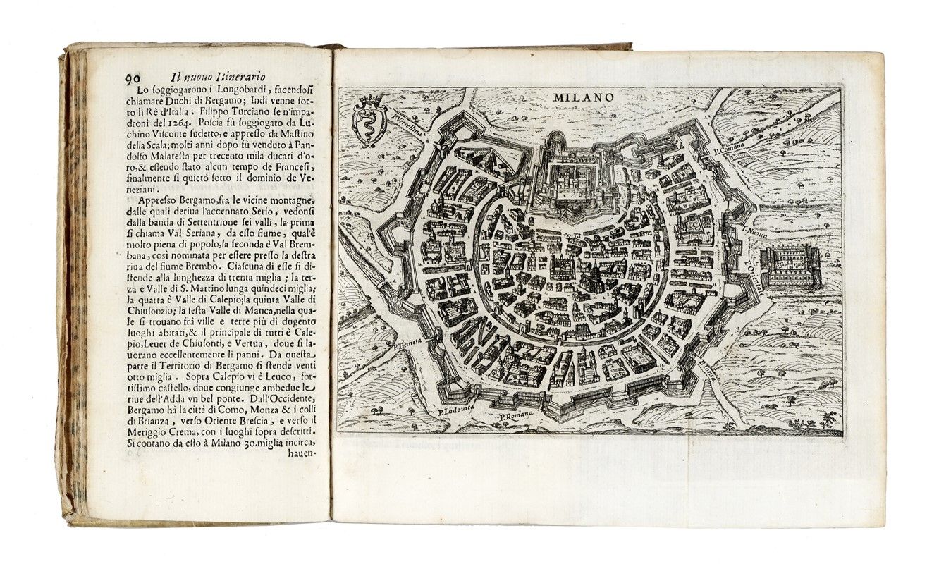 In-12° (mm 160 x 88). Testo scompleto e con qualche traccia del tempo, ma presenti l'antiporta e le 25 mappe calcografiche ripiegate (24 città e 1 dell'Italia). Pergamena semi-flessibile coeva con titolo manoscritto al dorso, tagli spruzzati (allentata e con tracce del tempo). SI AGGIUNGE: Echard Laurence, Dizionario geografico portatile [...] Tomo primo [- secondo]. A Bassano: a spese di Remondini di Venezia, 1793. Non collazionato ma presenti i due mappamondi ripiegati. In barbe, minime fioriture marginali, in mezza pergamena coeva (qualche difetto).
