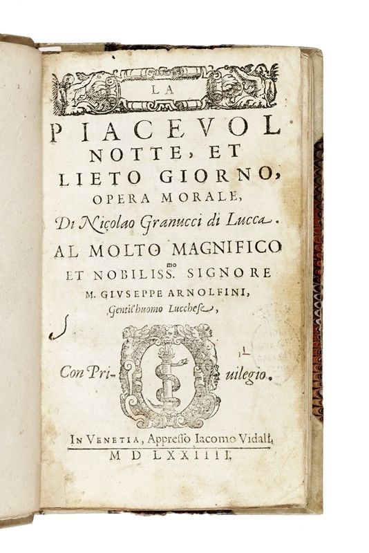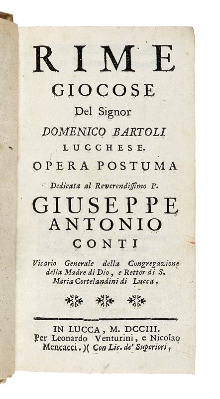 In-8° (mm 150x96). Pagine: 186, [2]. Marca degli editori Zanetti al frontespizio e del Vidali in fine. Primo fascicolo con aloni al margine esterno e altre tracce d'uso, qualche occasionale restauro al margine interno, qualche macchietta marginale, e altre trascurabili tracce del tempo. Timbro Galletti al frontespizio. Mezza pergamena posteriore con tassello in marocchino rosso al dorso. [SI AGGIUNGE:] Beverini Bartolomeo, Rime. In Lucca: per Francesco Marescandoli, 1654. In-12°, non collazionato, blocco del testo staccato dalla legatura, con bella antiporta calcografica e fregi tipografici, in pergamena flessibile coeva. [SI AGGIUNGE:] Bartoli Domenico, Rime giocose. In Lucca: per Leonardo Venturini, e Nicolao Mencacci, 1703. In-12° in pergamena flessibile coeva, non collazionato ma buona copia.