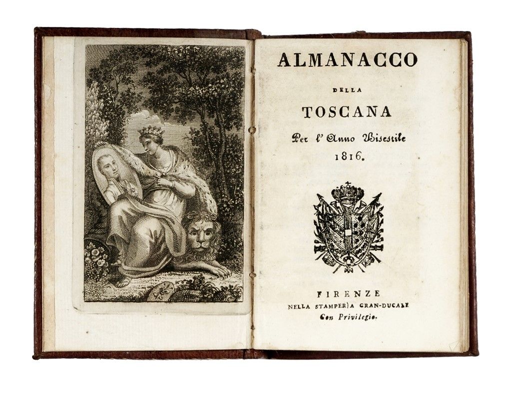 Compongono il lotto: 1) Almanacco della Toscana per l'anno 1815. Firenze: nella Stamperia Granducale, s.d.; 2) Almanacco della Toscana per l'anno 1816. Firenze nella Stamperia Granducale, s.d. I volumi sono in-24° (mm 105x68) con antiporta calcografica e una bella legatura in marocchino rosso con fregi in oro e armi Granducali ai piatti, tagli dorati.