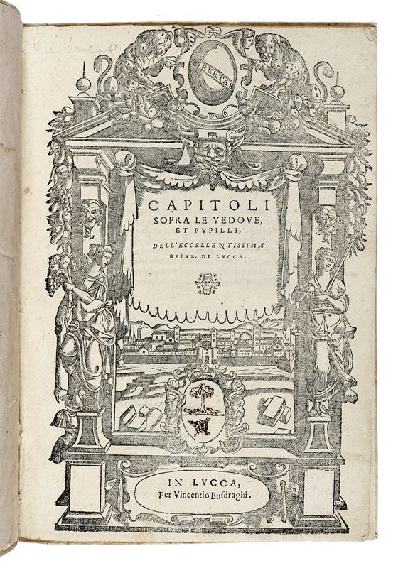 Compongono il lotto: 1) Leggi et decreti dell'eccell. Consig. generale, aggiunti alli statuti del quarto libro. In Lucca: appresso Vincenzio Busdraghi, 1589. In-folio in cartonato rustico coevo, non collazionato ma buona copia. 2) Capitoli sopra le vedove et pupilli della magnifica città di Lucca. In Lucca: per Vincentio Busdrago. (Al colophon:) Ristampata l'anno 1592. In-folio in legatura moderna, frontespizio xilografico architettonico con vedutina di Lucca, grandi iniziali xilografiche, con alla fine una carta extra con "Relatione di sei Cittadini" del 1655, non collazionato ma buona copia.