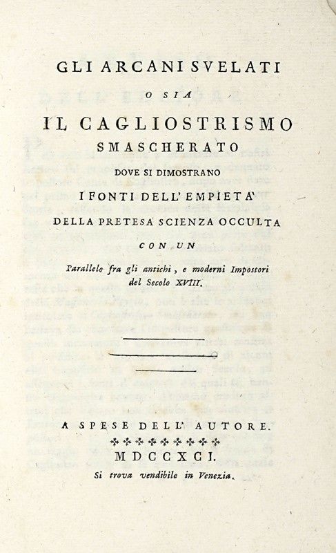 Compongono il lotto: 1) Compagnoni Giuseppe, Gli arcani svelati o sia Il cagliostrismo smascherato... S.l.: s.e., 1791; 2) Barberi Giovanni, Compendio della vita, e delle gesta di Giuseppe Balsamo denominato conte Cagliostro... In Roma: Nella stamperia della Rev. Camera Apostolica, 1791.