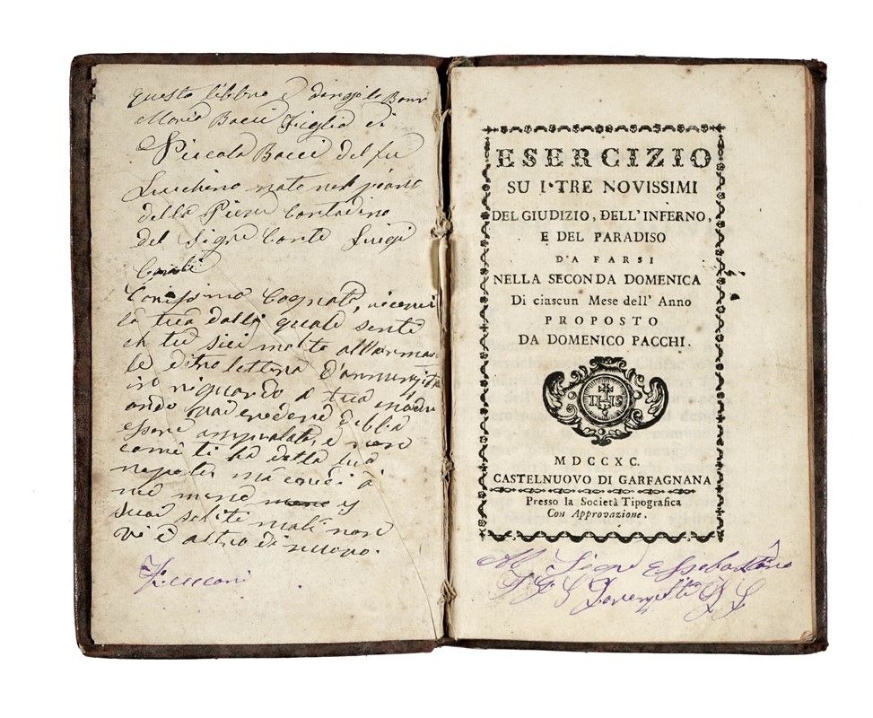 Compongono il lotto: 1) Fior di Virtù istoriato [...] con un capitolo in rima di Dante Alighieri alla Beata Vergine. In Macerata: Dalle Stampe di Luigi Chiappini, ed Antonio Cortesi. Con graziose vignette xilografiche; 2) Esercizio su i tre novissimi del giudizio, dell'inferno, e del paradiso... Castelnuovo di Garfagnana: Presso la Società Tipografica, s.d. Piena pelle coeva decorata in oro (sciupata).
