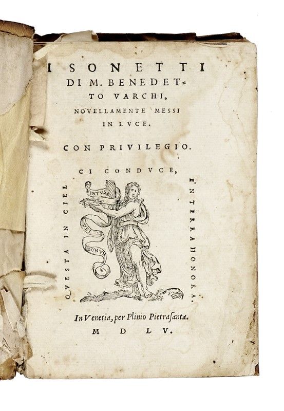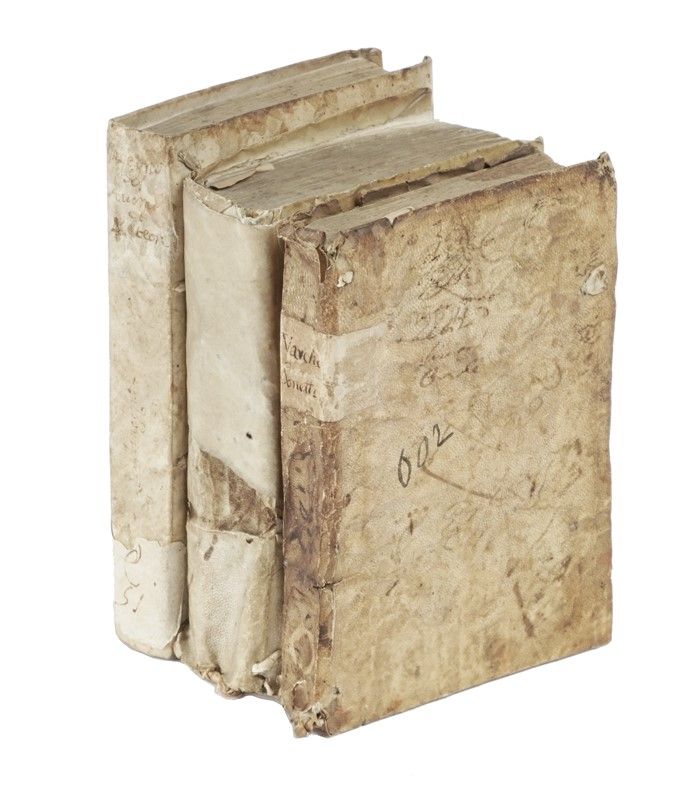Compongono il lotto: 1) Persio Antonio, Trattato dell'ingegno dell'huomo. In Vinetia: appresso Aldo Manutio, 1576. [RILEGATO CON:] Aristoteles, Opera nuova la quale tratta della filosofia naturale, chiamata la Metaura d'Aristotele; chiosata da San Thomaso d'Aquino [...] partita in tre libri. In Vinegia: per Comin da Trino, 1554. In-8° collazionato completo, bella copia con minime tracce del tempo, in pergamena flessibile coeva con frammenti di antica pergamena manoscritta all'interno: 2) Patrizi Francesco, De discorsi [...] sopra alle cose appartenenti ad una città libera, e famiglia nobile; tradotti in lingua toscana da Giovanni Fabrini fiorentino. 1545 (In Vinegia: in casa de' figliuoli di Aldo, 1545). In-8° in pergamena flessibile coeva (difetti), non collazionato ma privo dell'ancora aldina in fine; 3) Varchi Benedetto, I sonetti. In Venetia: per Plinio Pietrasanta, 1555. In-8° in pergamena flessibile coeva (sciupata), non collazionato e difetti da controllare.