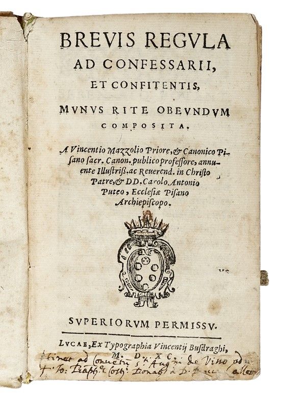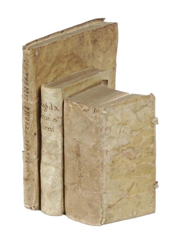 Compongono il lotto: 1) Lucensis ecclesiae constitutiones synodales... Lucae: apud Vincentium Busdracum, [1571]; 2) : Mazzoli Vincenzo, Brevis regula ad confessarii, et confitentis, munus rite obeundum composita... Lucae: ex typographia Vincentij Busdraghi, 1590; 3) Franciotti Cesare, Della verità discorsi XVIII... In Lucca: per il Busdrago a stanza di Giuliano Bacciolini, 1603. Tutti e 3 i volumi, non collazionati, sono in piena pergamena coeva.