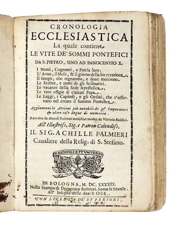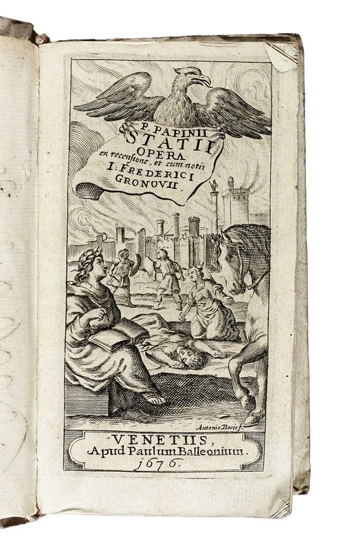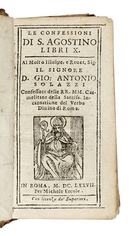 Compongono il lotto: 1) Augustinus Aurelius, Le confessioni di S. Agostino libri X. In Roma: per Michele Ercole, 1677. In-18° in pergamena flessibile coeva; 2) Aelianus Claudius, Peri zoon idiotetos biblion 17 [...] De animalium natura libri xvii. Geneuae, 1616. In-16° in pergamena flessibile coeva con titolo graziosamente manoscritto al dorso; 3) Statius Publius Papinius, Opera ex recensione, et cum notis I. Frederici Gronouij. Venetijs: apud Paulum Balleonium, 1676. In-12° con frontespizio inciso, in pergamena flessibile coeva; Baldini Vittorio, Cronologia ecclesiastica la quale contiene le vite de' sommi pontefici da S. Pietro, sino ad Innocentio X. In Bologna: nella stampa di Domenico Barbieri, 1649. In-8° piccolo in pergamena flessibile coeva, con un bel ritratto xilografico per ciascuno dei 242 papi descritti. Volumi non collazionati e con qualche piccolo difetto.