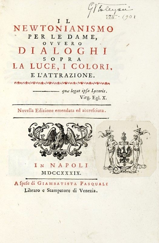 Compongono il lotto: 1) Algarotti Francesco, Il newtonianismo per le dame, ovvero Dialoghi sopra la luce, i colori, e l'attrazione... In Napoli: a spese di Giambatista Pasquali, 1739; 2) Id., Il neutonianismo ovvero Dialoghi sopra la luce, i colori, e l'attrazione... In Napoli: a spese degli Eredi Hertz, 1746.