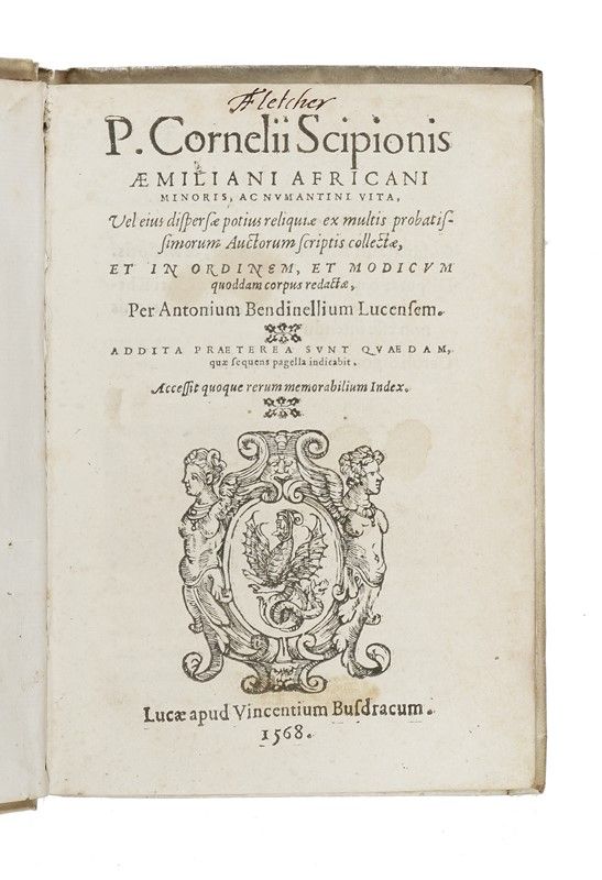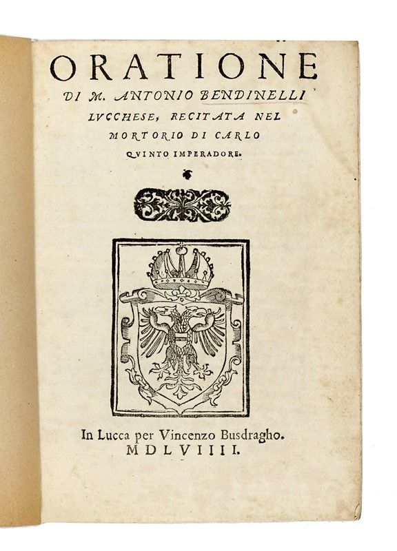 Compongono il lotto: 1) Bendinelli Antonio, Quae inter Antonium Bendinellium et Carolum Sigonium non conueniant, in libro de vita, et rebus gestis P. Scipionis Aemiliani. Lucae: apud Vincentium Busdracum, 1569. Placchetta in-4° con carte pallidamente brunite e restaurate al margine interno e al colophon, collazionata completa in mezza pergamena moderna; 2) Idem, Oratione [...] recitata nel mortorio di Carlo Quinto Imperatore. In Lucca: per Vincenzo Busdragho, 1559. In-4° con grande marca Busdraghi in fine (rifilata), grandi iniziali xilografiche, margine superiore corto, in brossura muta moderna; 3) Idem, P. Cornelii Scipionis Aemiliani Africani Minoris, ac Numantini vita. Lucae: apud Vincentium Busdracum, 1568. In-4° in pergamena flessibile coeva.