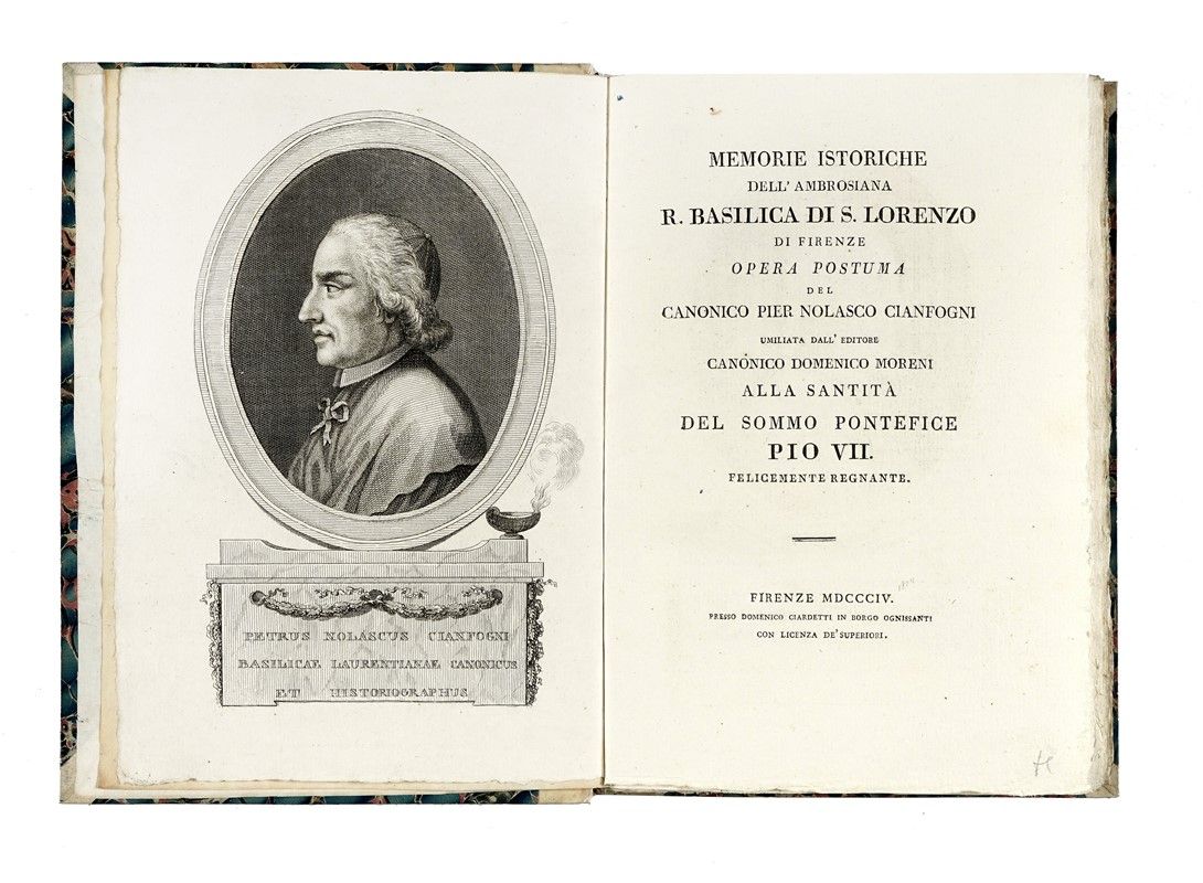 In-4° (mm 270x188). Esemplari in barbe. Antiporta calcografica con ritratto di Pietro Nolasco. Tavola con antico prospetto della Basilica di S. Lorenzo di Firenze a pagina 126. Carte fresche e croccanti. Nel lotto in legatura uniforme anche la Continuazione delle Memorie istoriche di Domenico Moreni del 1816-17 con qualche pallida brunitura. Qualche carta ancora intonsa. Volumi non collazionati. Legatura in mezza pergamena coeva con titoli dorati su tassello nero al dorso.