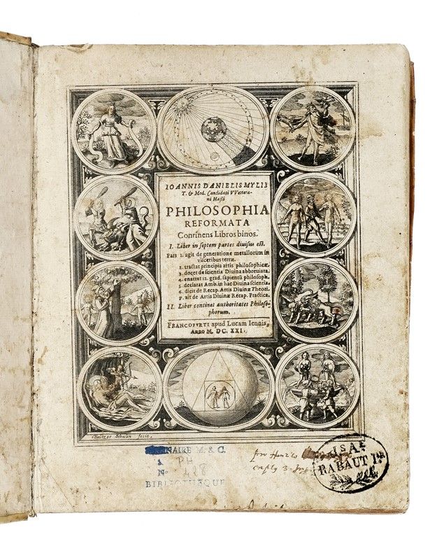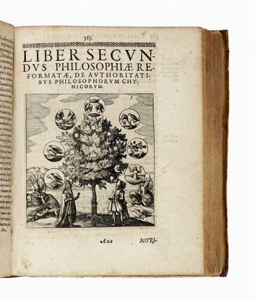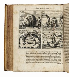 In 4° (mm 212x174). Pagine [38], 703, [35]. Collazionato completo (nota bene: SBN descrive gli ultimi fascicoli 3A-5A come di 8 carte ciascuno, ma sono in realtà di 4 carte ciascuno). Bella e ricca cornice calcografica sul frontespizio incisa da Balthasar Schwan, numerose finissime incisioni calcografiche nel testo, inclusa una più grande alla carta 3A di introduzione al secondo libro. Carte lievemente ingiallite, sottolineature e impercettibili segni a inchiostro rosso a una illustrazione, due timbri di biblioteche straniere, assente la sguardia anteriore volante. Nel complesso buona copia genuina nella sua pergamena rigida coeva.