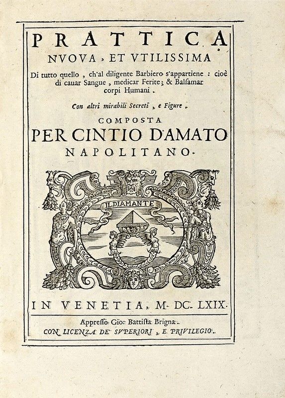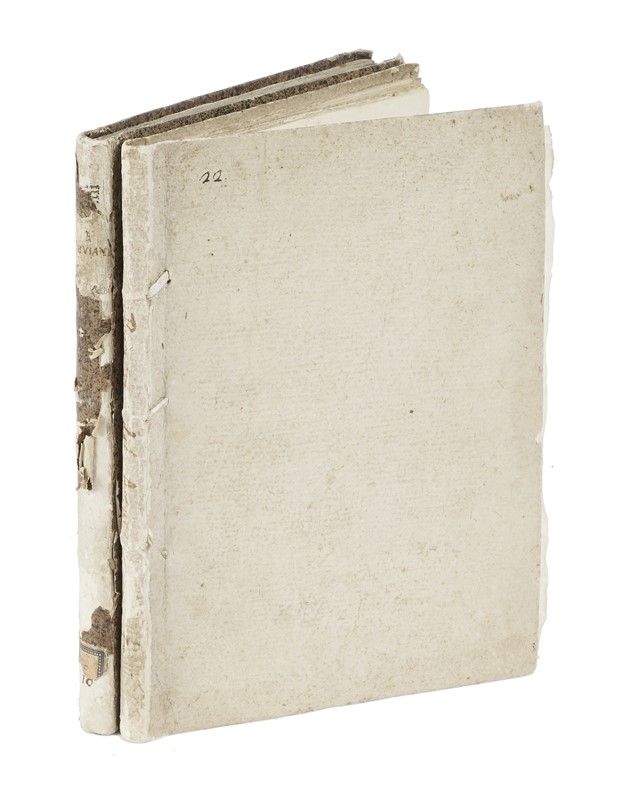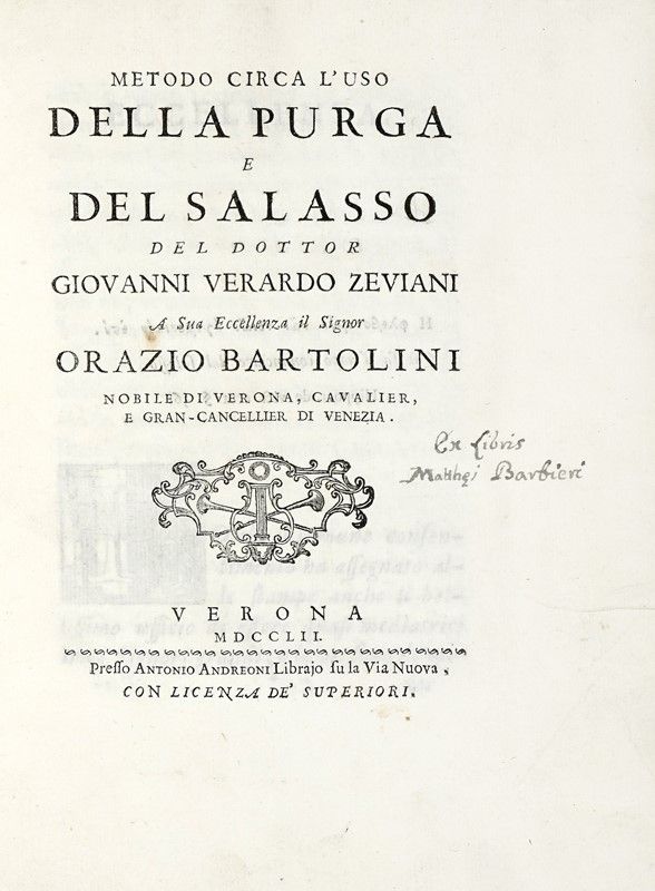 In-4° in barbe e cartonato rustico coevo, ma purtroppo scompleto di una carta iniziale e della carta E3 con le pagine 37 bianca e 38 con la figura del salasso alle mani. Grande marca tipografica al frontespizio, capilettera, testatine, finalini e 12 (di 13) illustrazioni a piena pagina nel testo, il tutto xilografico. [SI AGGIUNGE:] Zeviani Giovanni Verardo, Metodo circa l'uso della purga e del salasso. Verona: presso Antonio Andreoni, 1752. In-4° in barbe e cartonato coevo (sciupato al dorso), non collazionato ma internamente fresco.