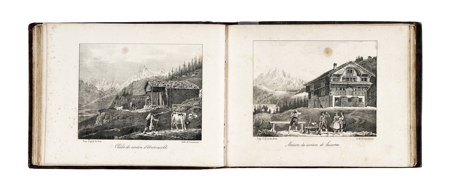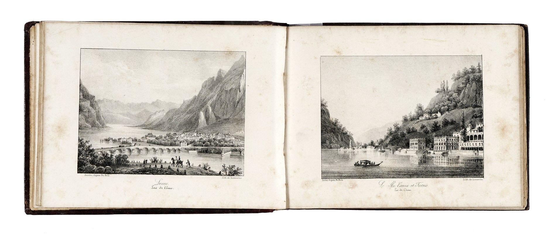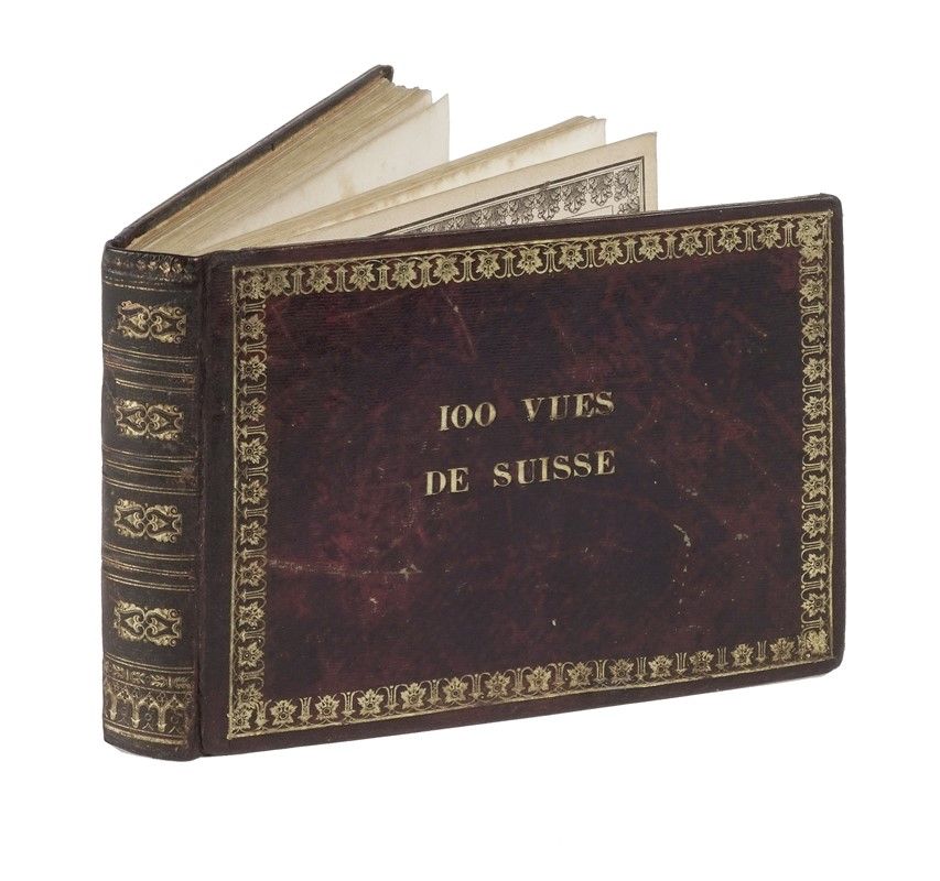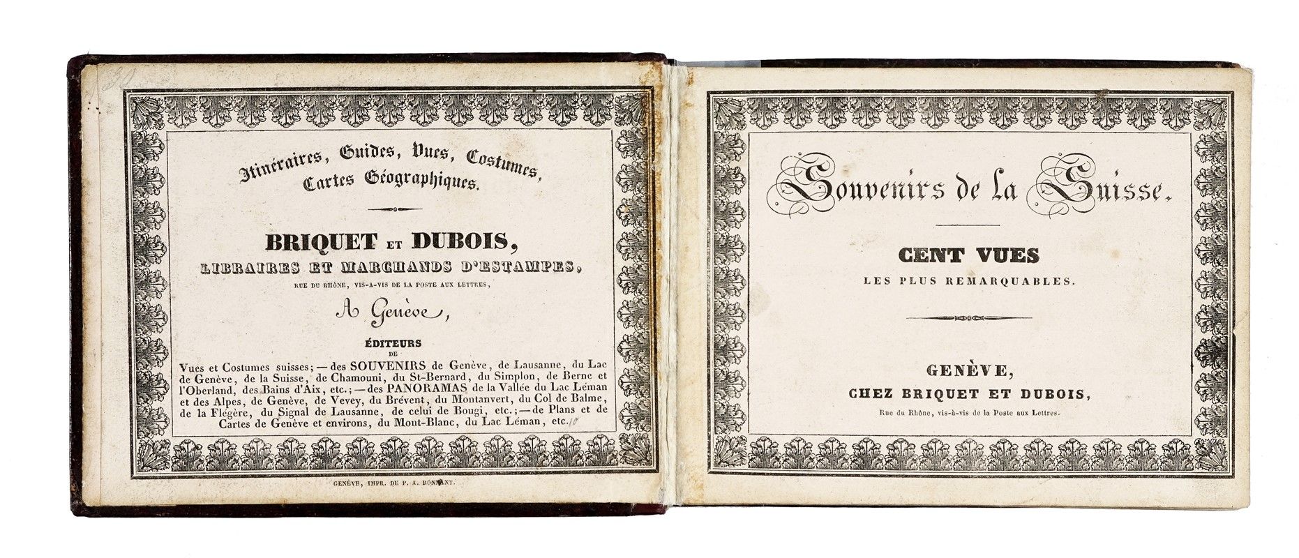 In-8° piccolo oblungo (mm 130x172). Prima carta con presentazione Briquet et Dubois applicata al contropiatto anteriore, seguita dal frontespizio (entrambe entro bella cornice floreale), e da 98 (di 100) vedute litografiche, ciascuna con la propria didascalia. Fioriture e piccole macchioline, un paio di fascicoli leggermente allentati e protrusi, trascurabili interventi a matita al verso di un paio di tavole. Legatura editoriale in marocchino rosso scuro elegantemente decorato in oro ai piatti e al dorso, tagli dorati, sguardie rosa (un po' sciupata).