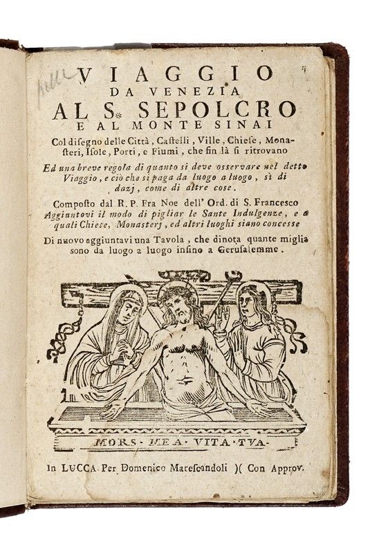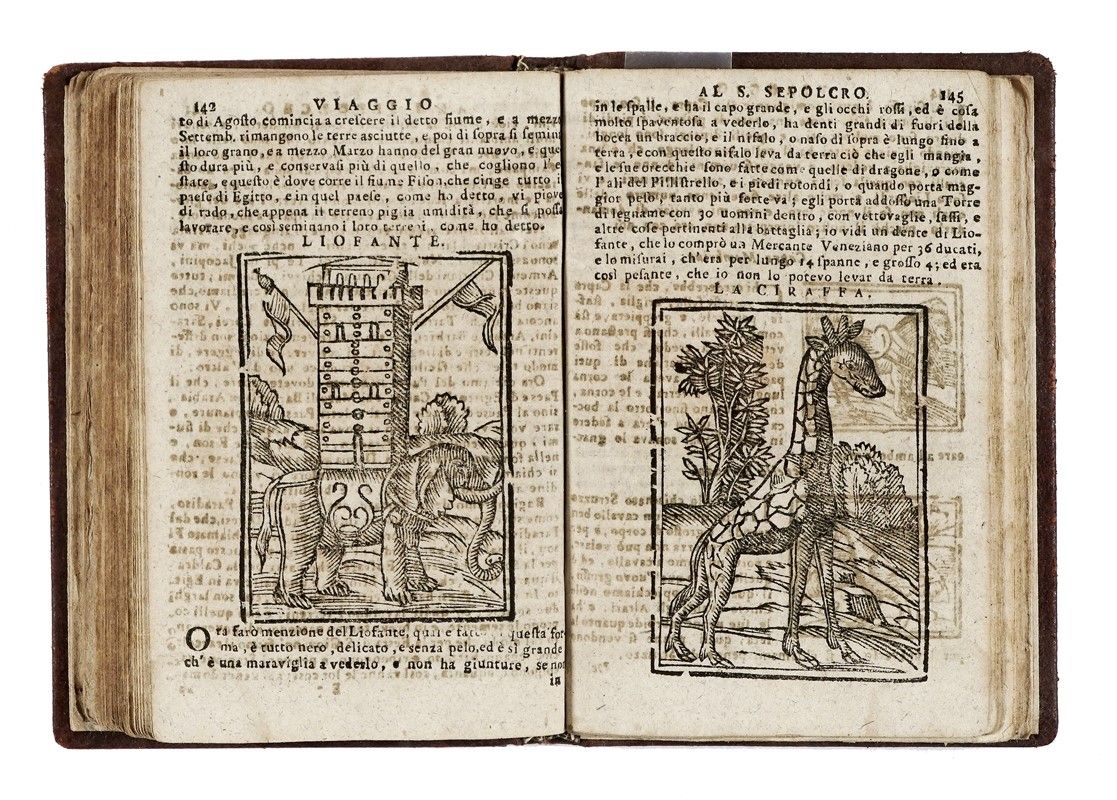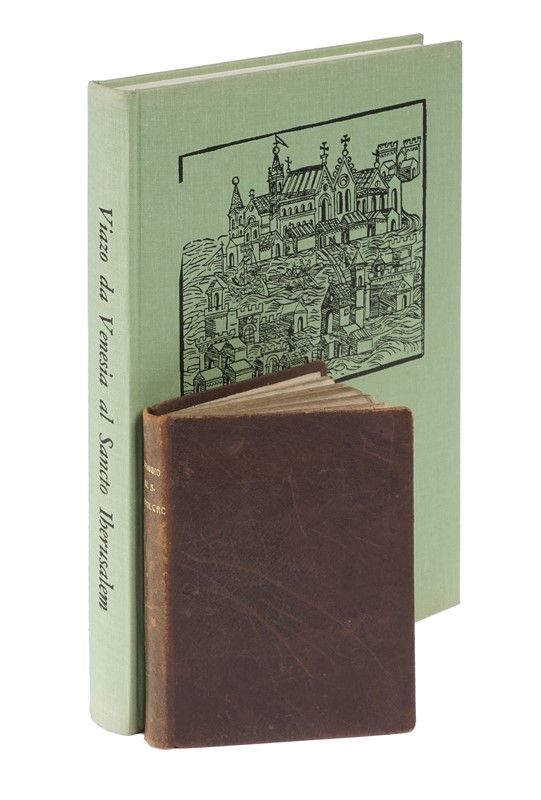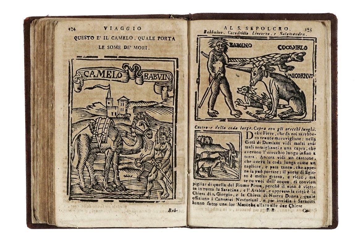 In 8° piccolo (mm 146x98). Pagine: 192, profusamente illustrate da vignette xilografiche di varie dimensioni (carte uniformemente ingiallite e con qualche macchia, xilografie talvolta un po' sbiadite). Piena pelle moderna con titolo in oro al dorso. SI AGGIUNGE: Petrucci Armando e Franca (a cura di), Viazo da Venesia al Sancto Iherusalem, Edizioni dell'Elefante, (1972).