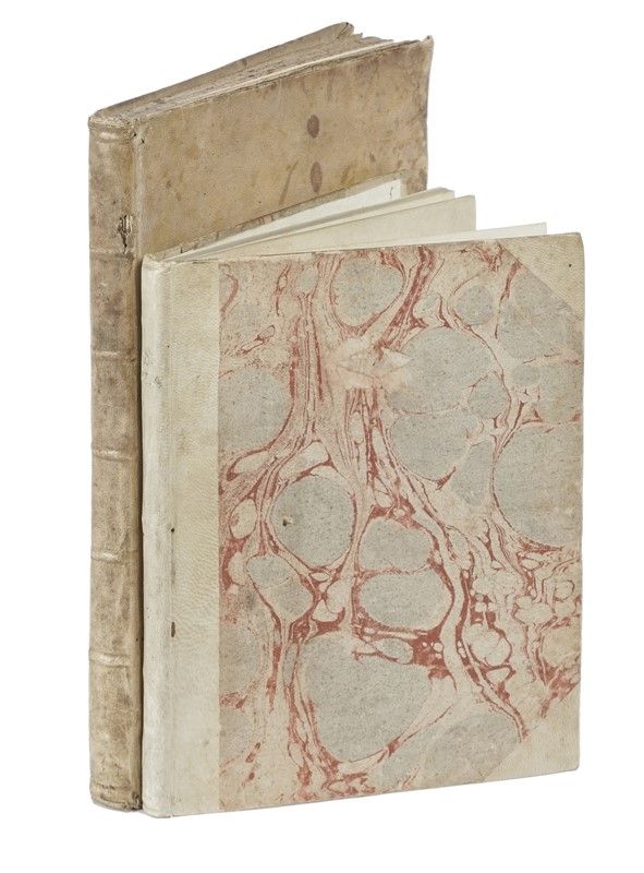 In-4° (mm 189x141). Pagine: [12], 108. Vignetta xilografica sul verso del frontespizio raffigurante l'altare con il corpo di S. Zita, iniziali xilografiche, testo in corsivo. Piccolo strappo restaurato al verso del frontespizio, qualche pallida fioritura e alone. Mezza pergamena posteriore. Ex libris armoriale di Francesco Maria Riccardi del Vernaccia, ex libris del Barone Landau (n. 22386), timbro Galletti al frontespizio. SI AGGIUNGE: Vita beatae Zitae virginis Lucensis, ex vetustissimo codice M.S. fidelitèr transumpta. Ferrariae: ex typographia Filoniana, 1688. In 4° (mm 241x163). Pagine: [8], 107, [1]. Il fascicolo L erroneamente chiamato M e composto da 5 carte e non 4 (ma ben completo come da copia digitalizzata). Bel ritratto calcografico della Santa in antiporta. Un pallido alone marginale alle carte finali, e altre tracce del tempo. Pergamena flessibile coeva, tagli spruzzati.