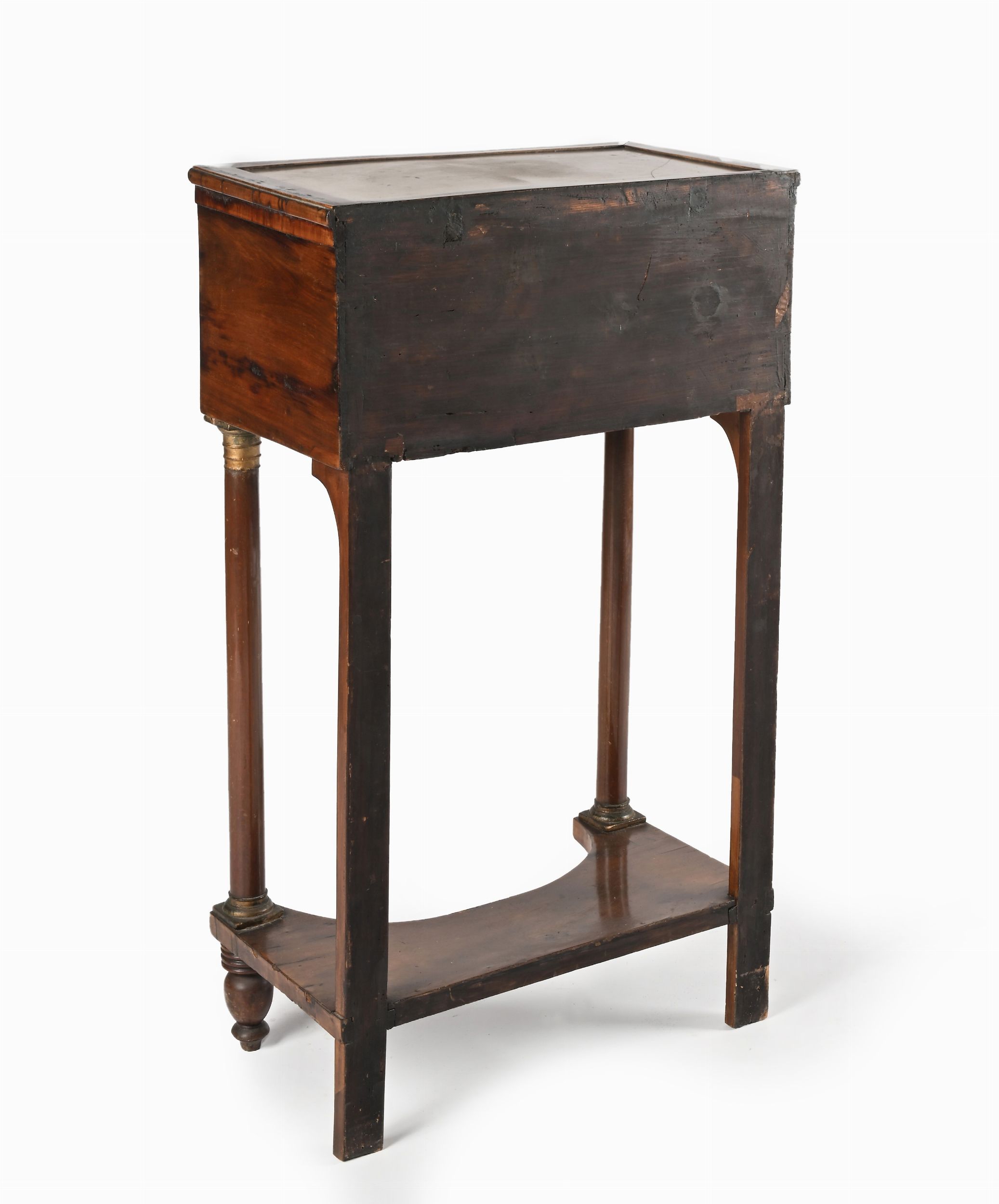 piano rettangolare in marmo bianco incassato, due cassetti in colonna frontali, montanti anteriori a colonna e posteriori a lesena su base sagomata; piedi anteriori torniti