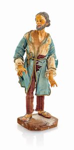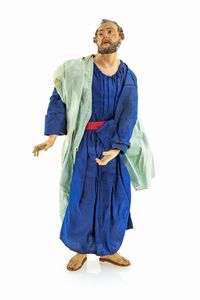 altezza cm 34 camicia beige, lunga giacca celeste trattenuta in vita da un cordone, pantaloni e sandali ai piedi. [..]