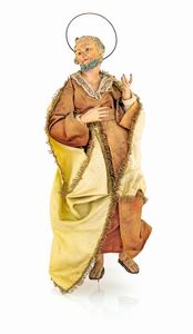 altezza cm 34 camicia bianca orlata di merletto, tunica bruna e mantello giallo con gallonatura; aureola ad anello [..]