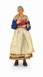 altezza cm 27 cuffia in creta azzurra, camicia plissettata, maniche blu e corsetto rosso; ampia gonna in seta [..]