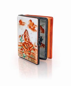 cm 2,5x8x6 decorata in arancio e verde da figura di orientale; profilo e cerniera in metallo