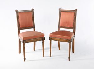 cm 100x60x55 con cornici intagliate e tessuto a righe; schienali squadrati caratterizzati da pinnacoli angolari, [..]