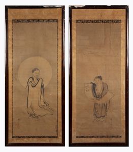 inchiostro e acquerello monocromo su seta, cm 110x44 - in cornice cm 138x60 attribuibili al pittore Yasunobu Kano, [..]