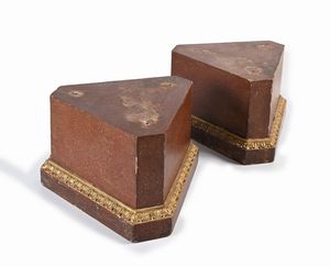 cm 32x55x52 di forma triangolare recano spigoli scantonati e profilo inferiore percorso da cornice intagliata [..]