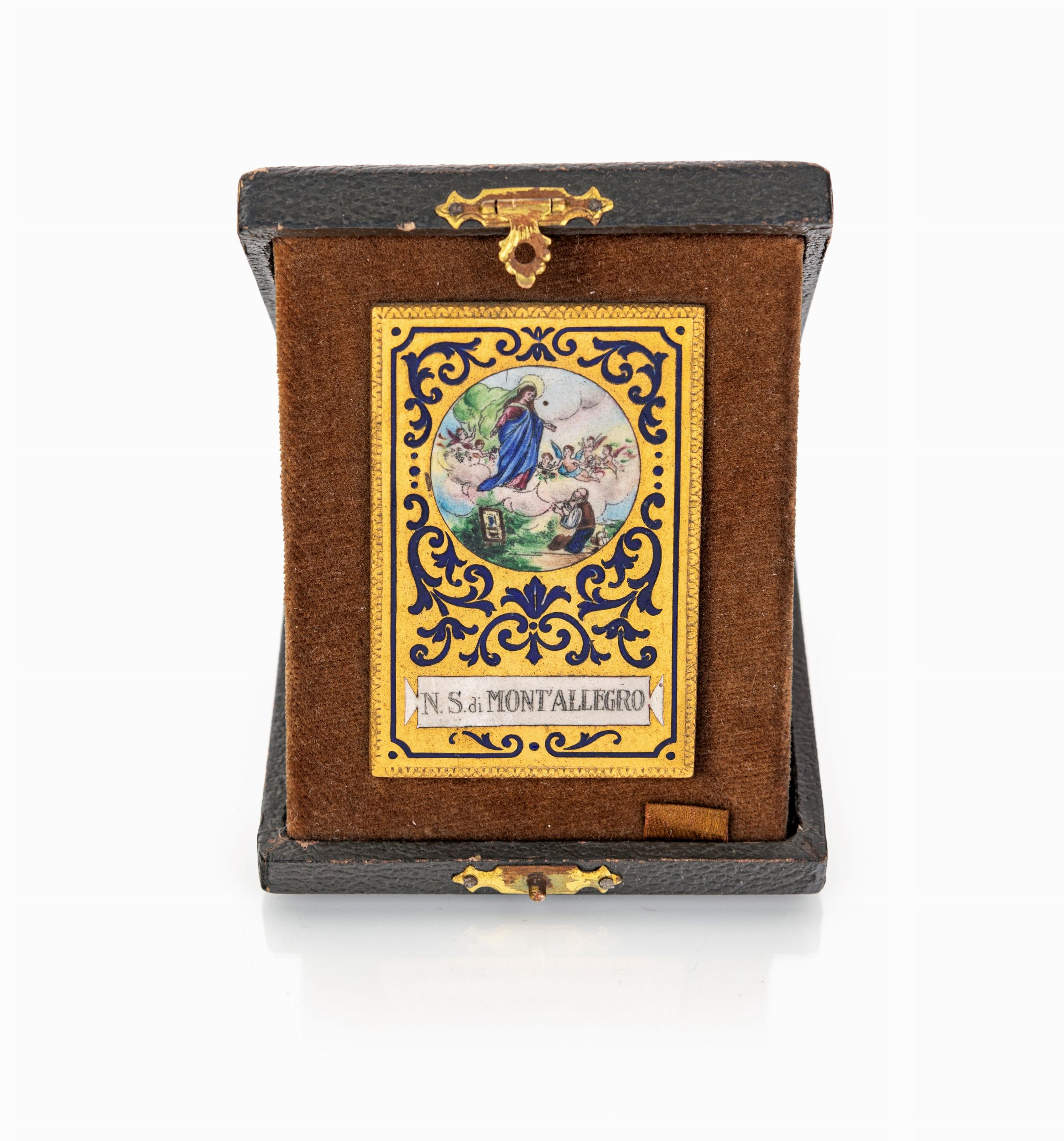 cm 5,5x4 - astuccio cm 1x8,5x6,7 di forma rettangolare reca miniatura circolare in smalti policromi raffigurante l'apparizione mariana di Mont'Allegro, circondata da volute vegetali blu; lungo il profilo inferiore cartiglio con titolo. Custodita entro astuccio espositore originale