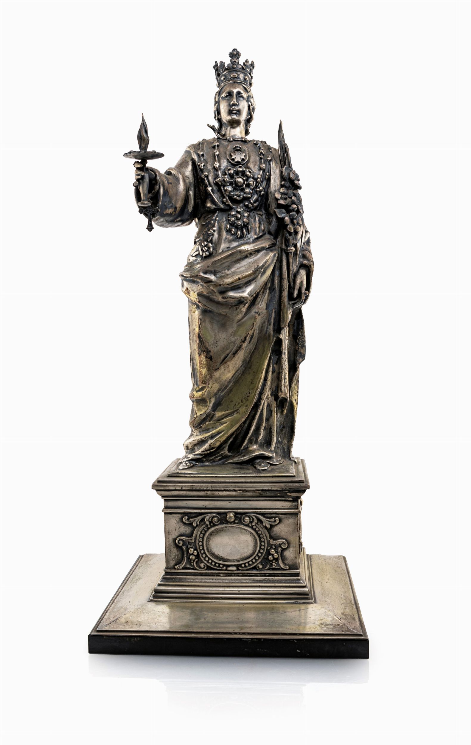 metallo argentato, cm 55x24x24 la figura trae ispirazione dall'opera orafa di Pietro Rizzo realizzata a Palermo e custodita nella nicchia della cappella a lei dedicata nel Duomo di Siracusa; la Santa è ritratta con la testa coronata ed un pugnale che le trafigge il collo; la mano destra sostiene la coppa con i due occhi separati da una fiamma, mentre la sinistra regge un ramo di palma e un giglio; alto piedistallo squadrato