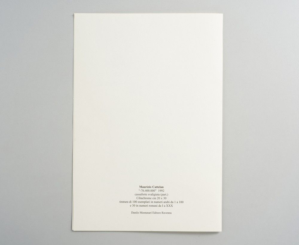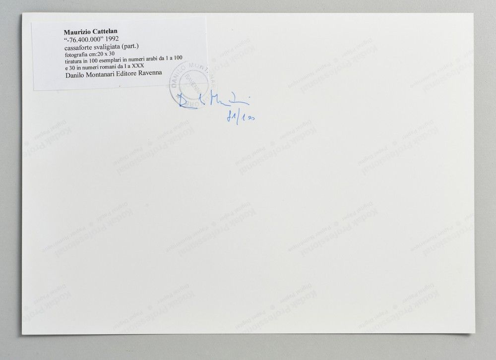 Cartella contenente una stampa cibachrome, es. 81/100 EDIZIONE TOTALE100 esemplari in numeri arabi da 1 a 100 e 30 in numeri romani da I a XXX, Danilo Montanari Editore, RavennaDimensioni della cartella: 32 x 22 cmDimensioni della stampa cibachrome: 20 x 27,8 cmTimbro e firma Danilo Montanari Editore e numerazione al retro della stampa cibachrome