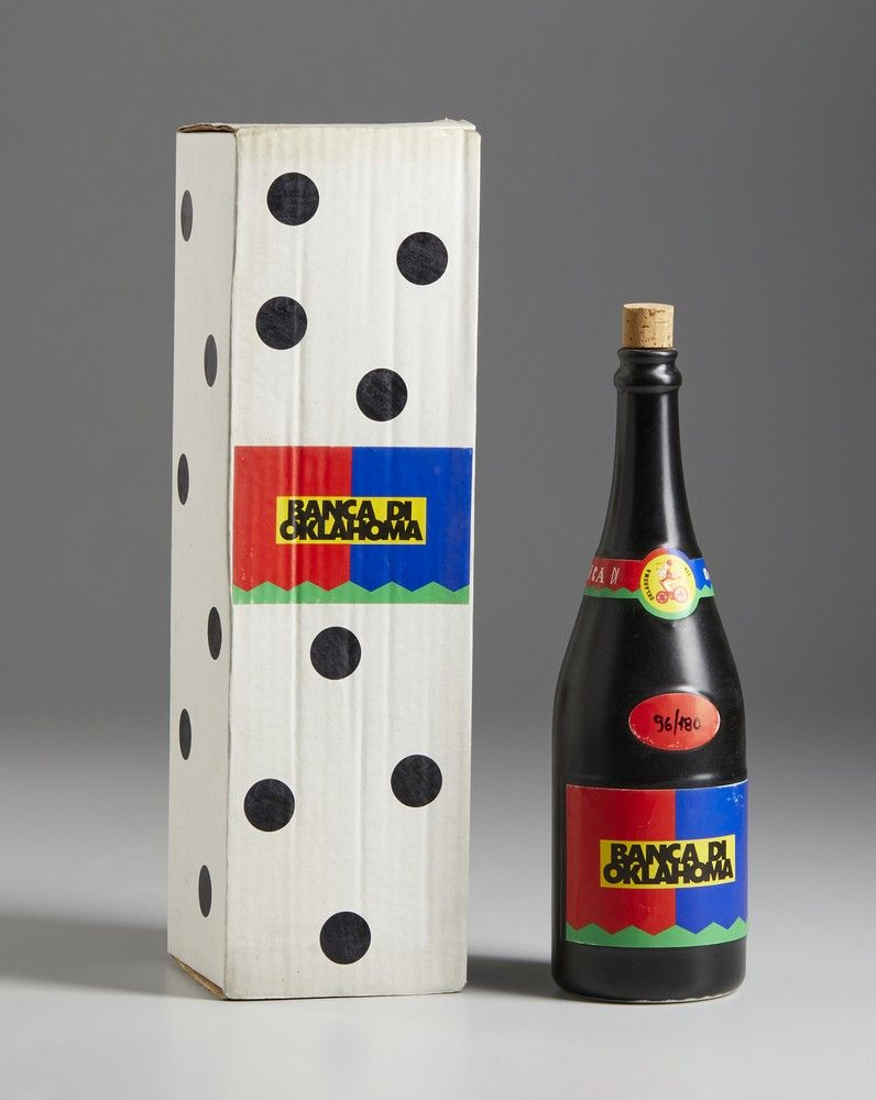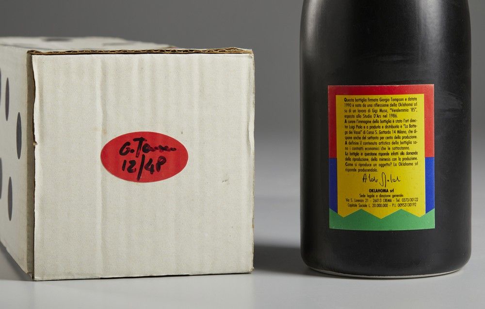 firma, es. 96/180La bottiglia, firmata Giorgio Tompson, è una riflessione della Oklahoma srl sull'opera 'Vendemmia '85' di Gigi Musa. Prodotta e distribuita da La Bottega dei Vasai, Milano.