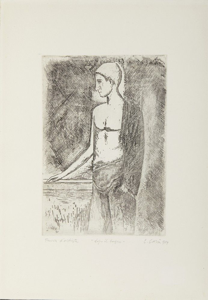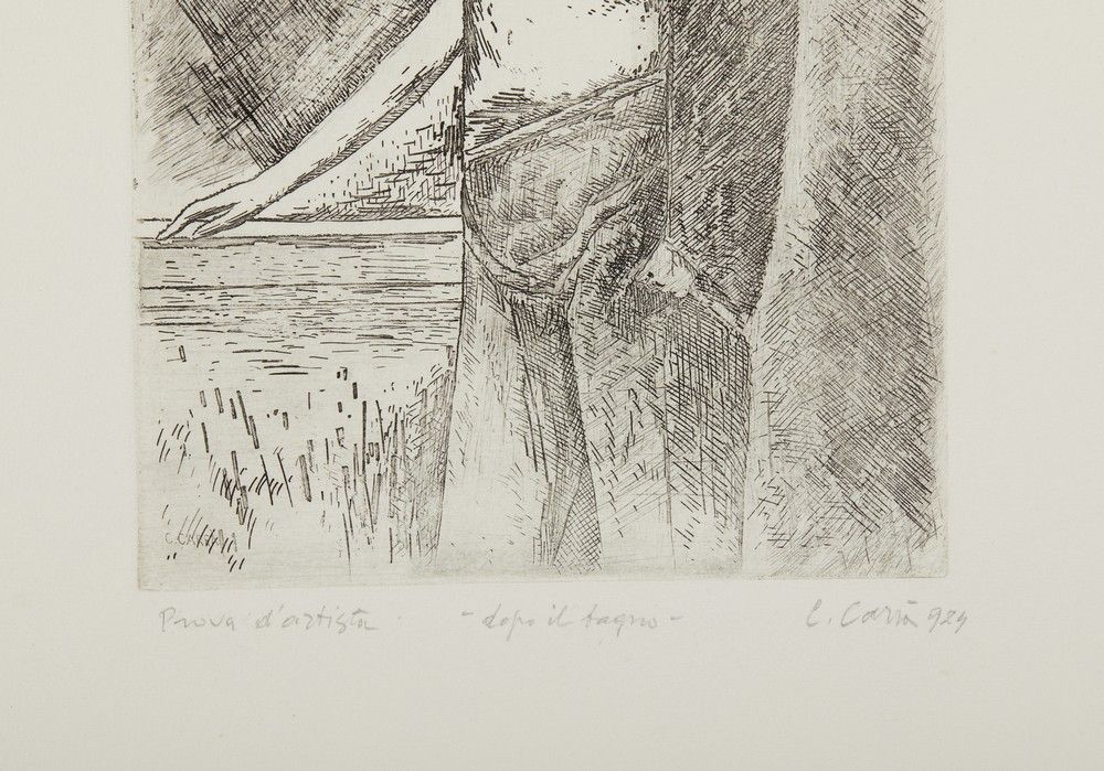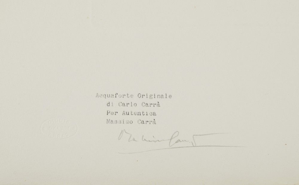 firma, data, titolo e tiratura a matita, es. p.d.a.firma in lastra.timbro a secco Studio Milano Carrà, timbro a secco Luigi De Tullio stampatoresul retro: timbro di autenticità a cura di Massimo Carrà. dimensione lastra: 30x20,5cm. stampatore: Luigi De Tullio, Milano