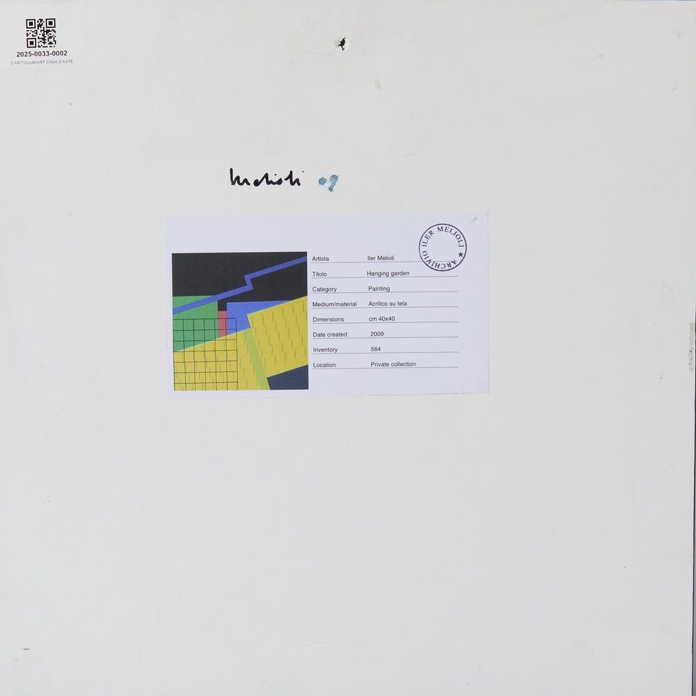 firma e datasul retro: firma e dataL' opera è accompagnata da certificato di archiviazione dell'archivio Iler Melloli BIBLIOGRAFIAIler Melioli. Giardini Pensili, Catalogo della mostra, Cortina Arte, Milano (16 aprile-11 maggio 2013)ESPOSIZIONIIler Melioli. Giardini Pensili, Cortina Arte, Milano (16 aprile-11 maggio 2013)