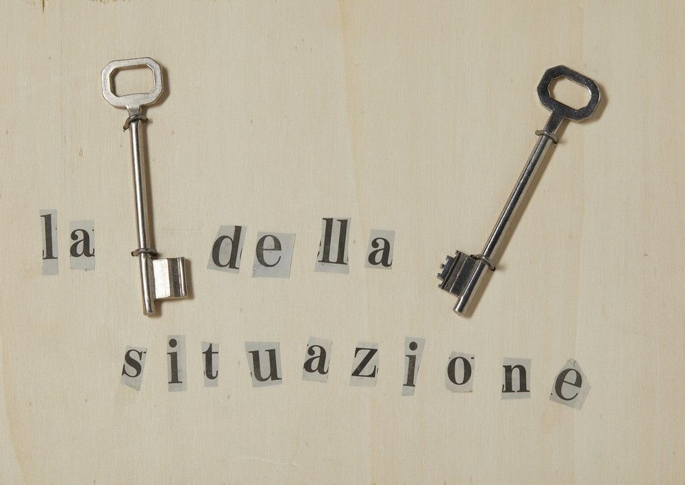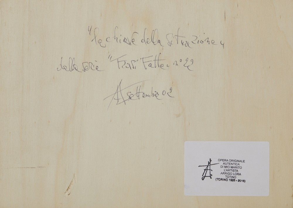 sul retro: firma, titolo, etichetta di autenticità a cura della moglie. Dalla serie 'Frasi fatte', n. 22.PROVENIENZAEredi Lora Totino, CuneoCollezione privata, Roma