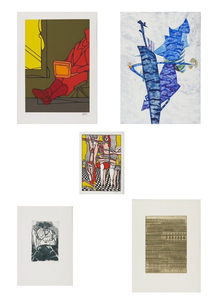 LUCIANO MINGUZZIacquafortedimensioni: 49,5x34,6 cmdimensioni lastra: 25,5x16,6 cmAGENORE FABBRI litografiadimensioni: 38,7x27,6 cmdimensioni lastra: 34x24cmfirma a matita in basso a destra, es. n. 41/100 a matita in basso a sinistra, filigrana del foglioARNALDO POMODOROserigrafiadimensioni: 57,5x43 cmdimensioni lastra: 35,5x25 cmfirma, data (1976) a matita in basso a destra, es. n. 81/100 a matita in basso a sinistra, filigrana del foglioVALERIO ADAMI serigrafiadimensioni:69,5x49,5 cmdimensioni lastra: 57x40 cmfirma a matita in basso a destra, es. n. 11/100 a matita in basso a sinistraGIANNI DOVA serigrafia matericadimensioni: 70x50 cmfirma in basso a destra, es. n. 98/100