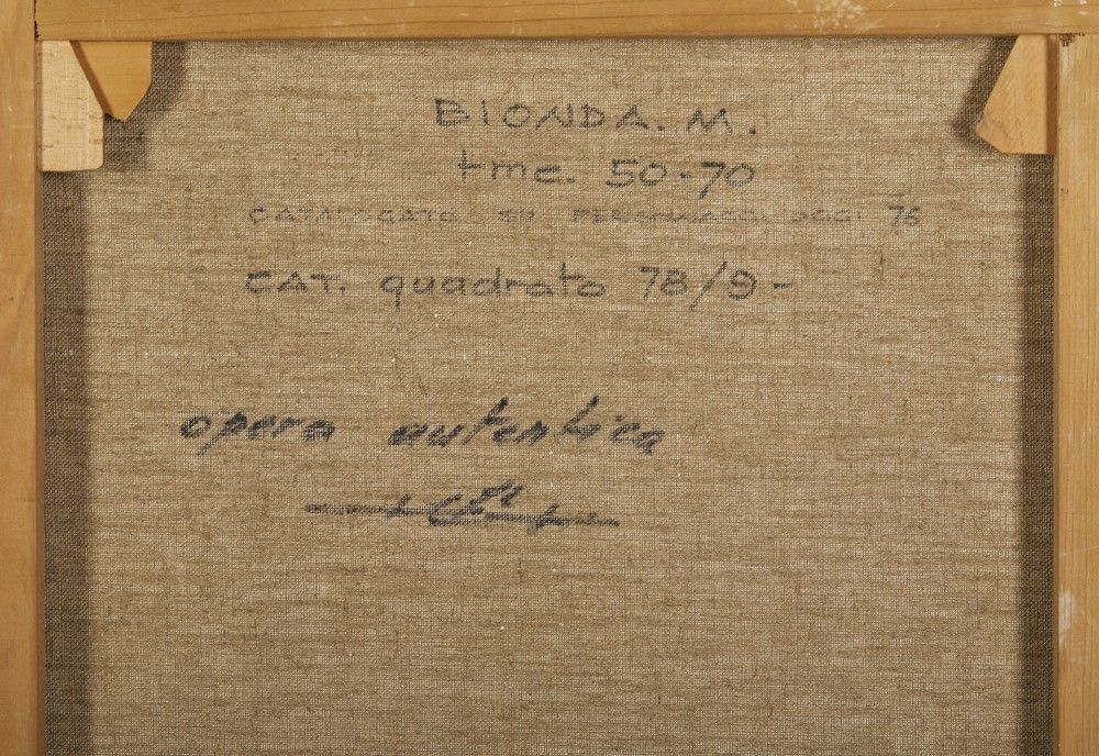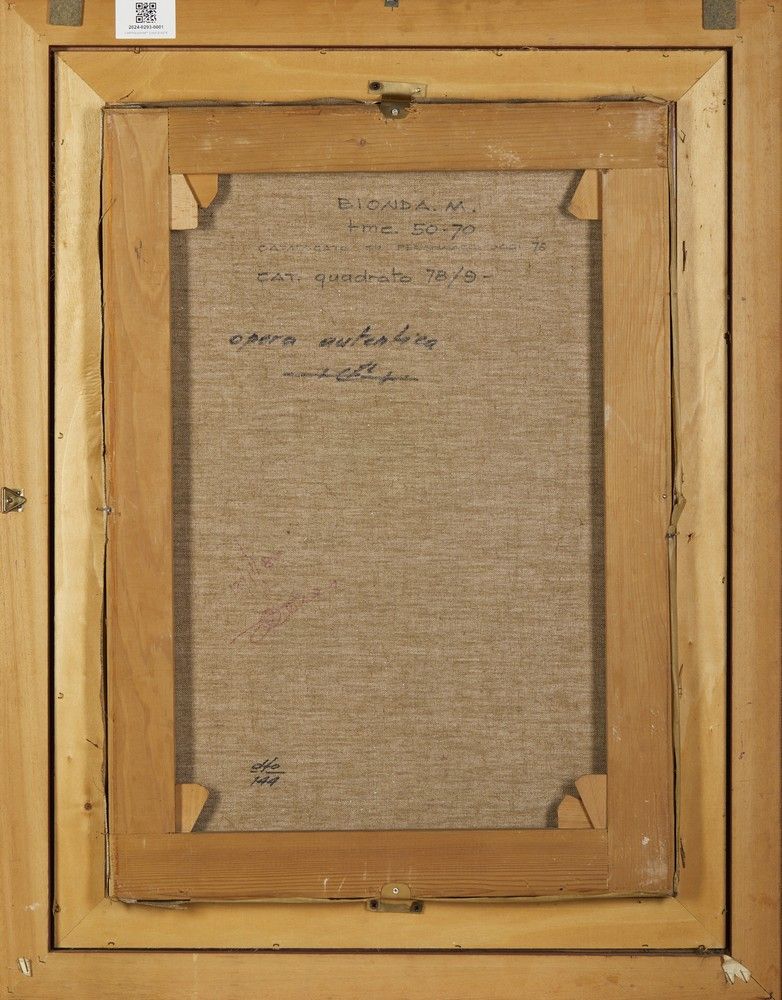 firmasul retro: firmal'opera è inclusa nel Catalogo Generale delle Opere di Mario Bionda, accompagnata da certificazione di autenticità e archiviazione a cura del Catalogo Generale delle Opere di Mario BiondaBIBLIOGRAFIACatalogo Generale delle Opere di Mario BiondaPROVENIENZACollezione privata